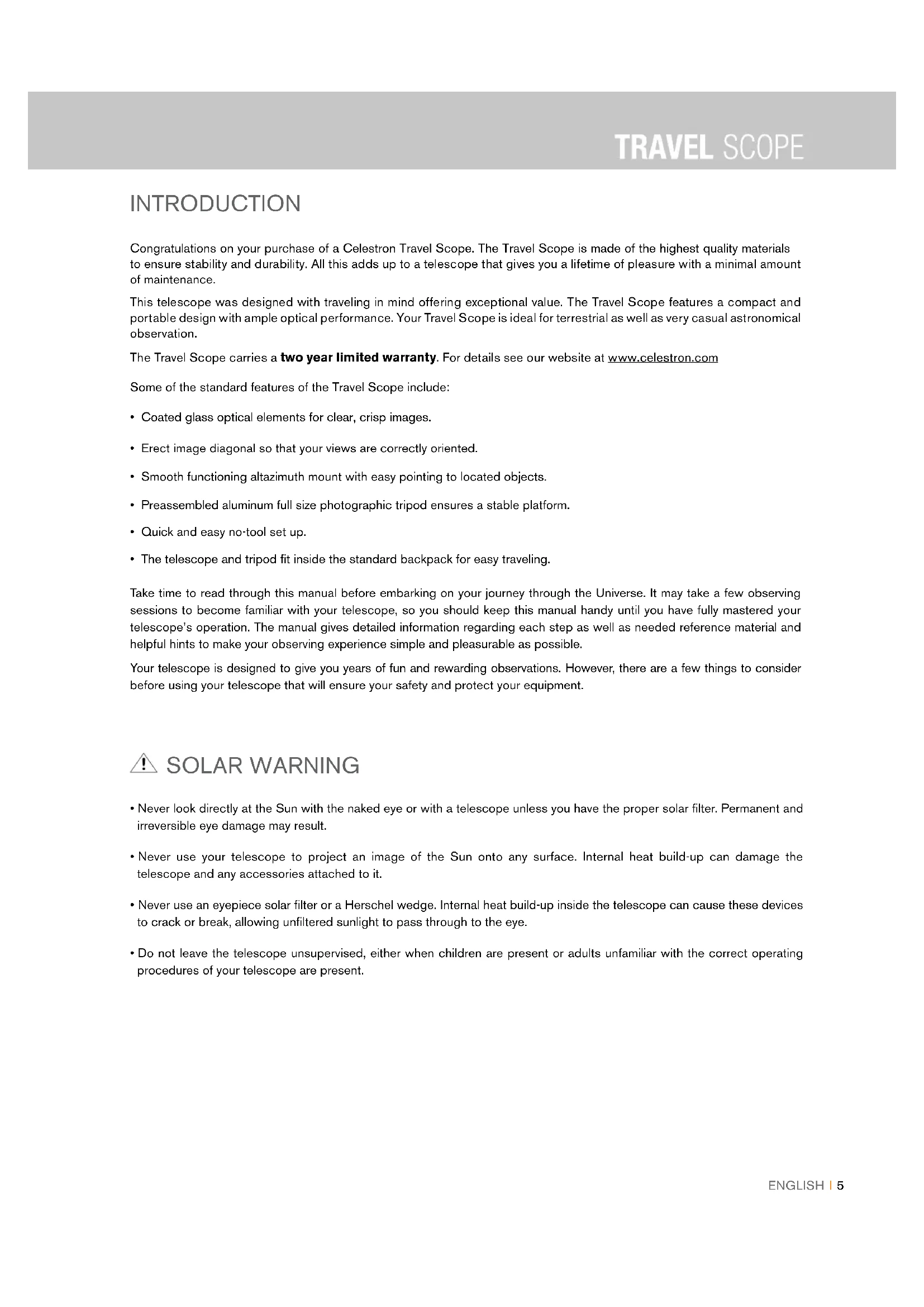 - The telescope and tripod fit inside the standard backpack for easy traveling. Take time to read through this manual before embarking on your journey through the Universe. It may take a few observing sessions to become familiar with your telescope, so you should keep this manual handy until you have fully mastered your telescope’s operation. The manual gives detailed information regarding each step as well as needed reference material and helpful hints to make your observing experience simple and pleasurable as possible. Your telescope is designed to give you years of fun and rewarding observations. However, there are a few things to consider before using your telescope that will ensure your safety and protect your equipment. INTRODUCTION