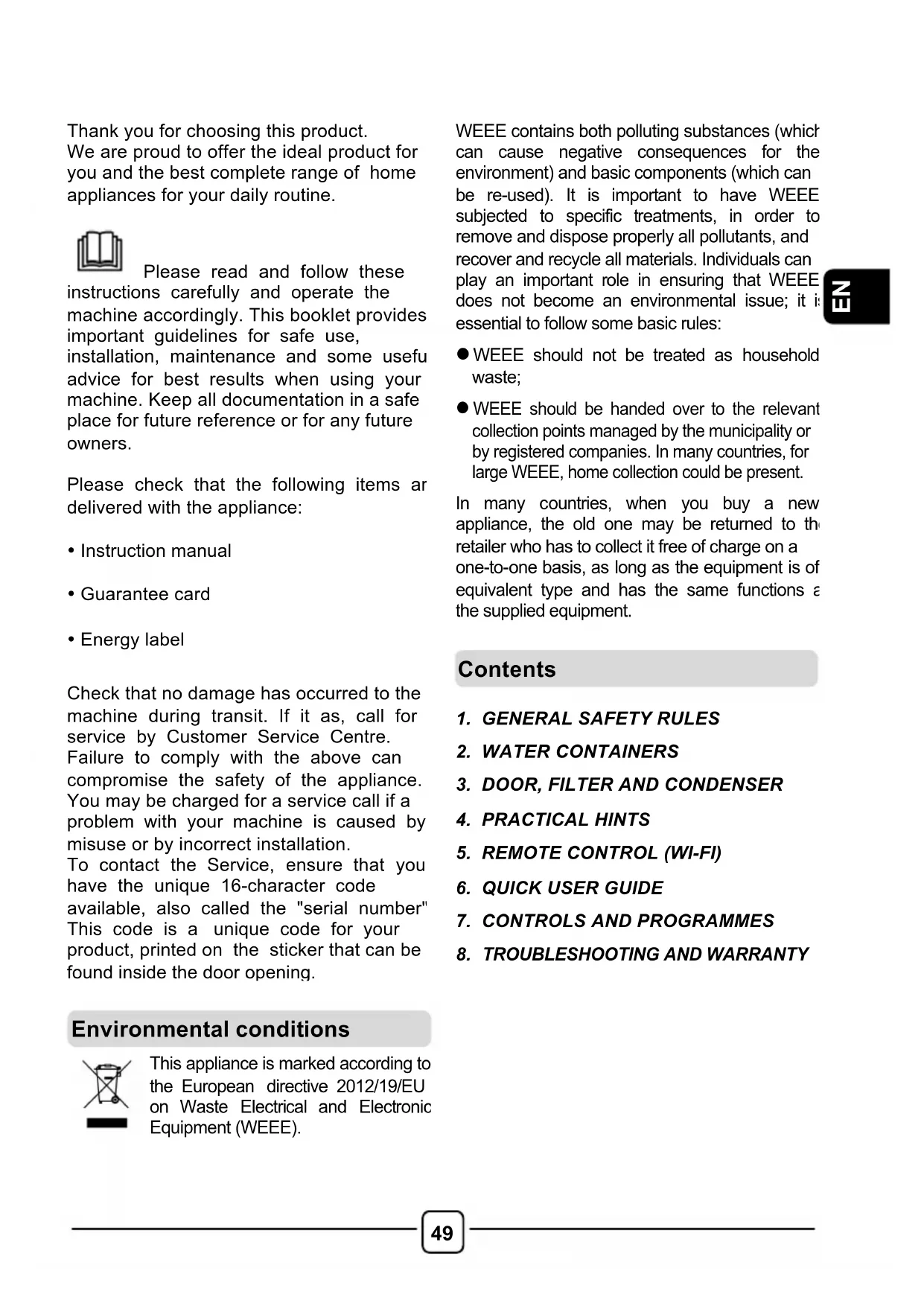 Thank you for choosing this product. We are proud to offer the ideal product for you and the best complete range of home appliances for your daily routine. Please read and follow these instructions carefully and operate the machine accordingly. This booklet provides important guidelines for safe use, installation, maintenance and some useful advice for best results when using your machine. Keep all documentation in a safe place for future reference or for any future owners. Please check that the following items are delivered with the appliance: