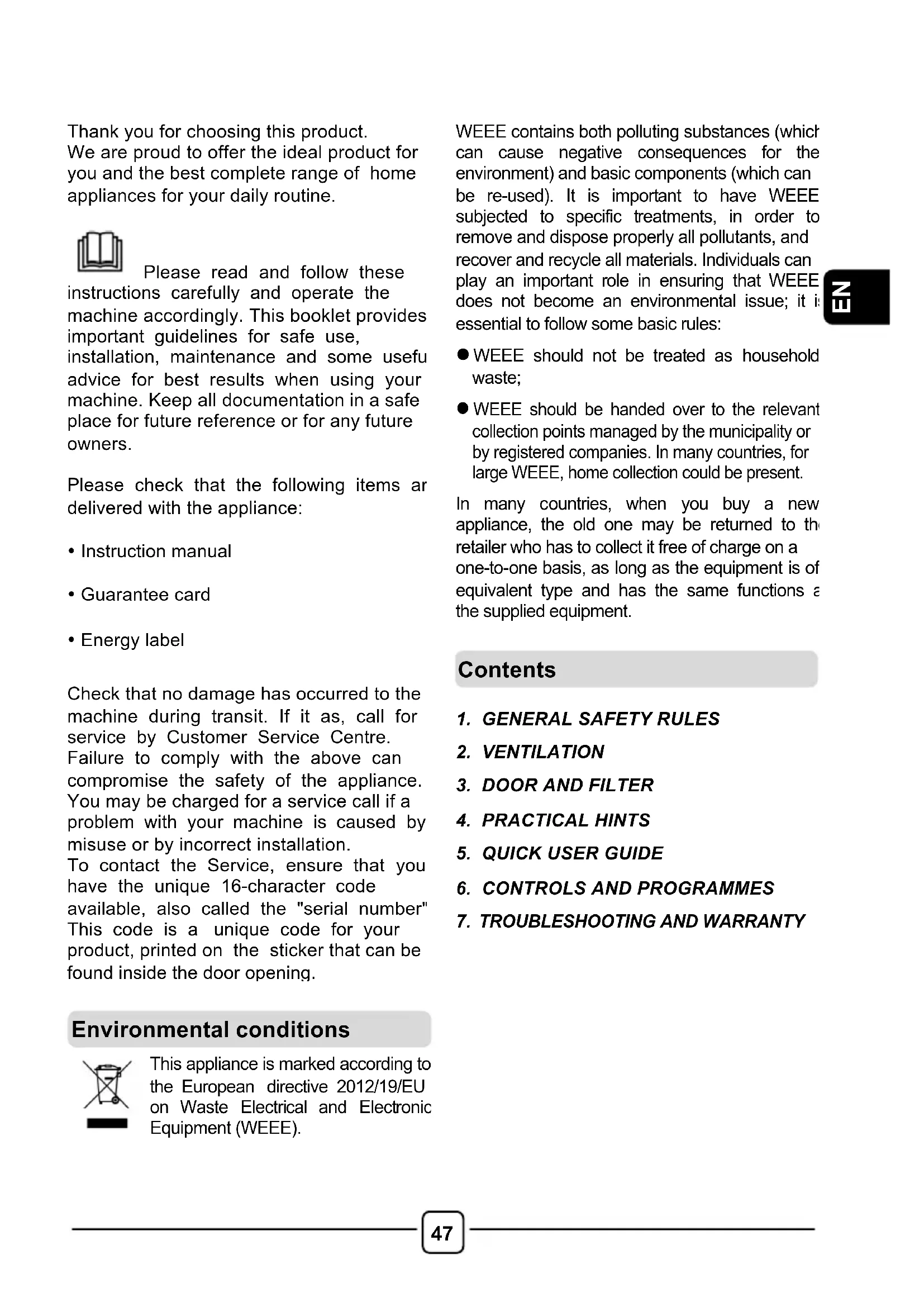 Thank you for choosing this product. We are proud to offer the ideal product for you and the best complete range of home appliances for your daily routine. Please read and follow these instructions carefully and operate the machine accordingly. This booklet provides important guidelines for safe use, installation, maintenance and some useful advice for best results when using your machine. Keep all documentation in a safe place for future reference or for any future owners. Please check that the following items are delivered with the appliance: