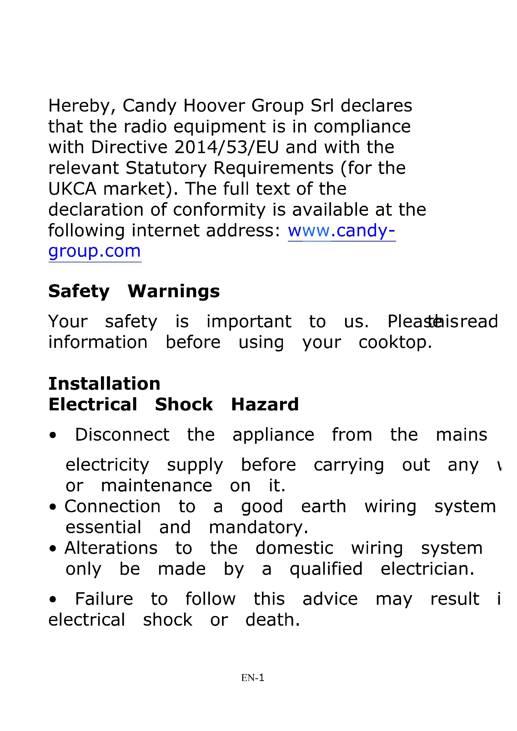 Thank you for purchasing the HOOVER induction hob. Please read this instruction manual carefully before using the hob and keep it in a safe place for future reference.EN-1 Hereby, Candy Hoover Group Srl declares that the radio equipment is in compliance with Directive 2014/53/EU and with the relevant Statutory Requirements (for the UKCA market). The full text of the declaration of conformity is available at the following internet address: www.candy- group.com Safety Warnings Your safety is important to us. Please read information before using your cooktop. Installation Electrical Shock Hazard this