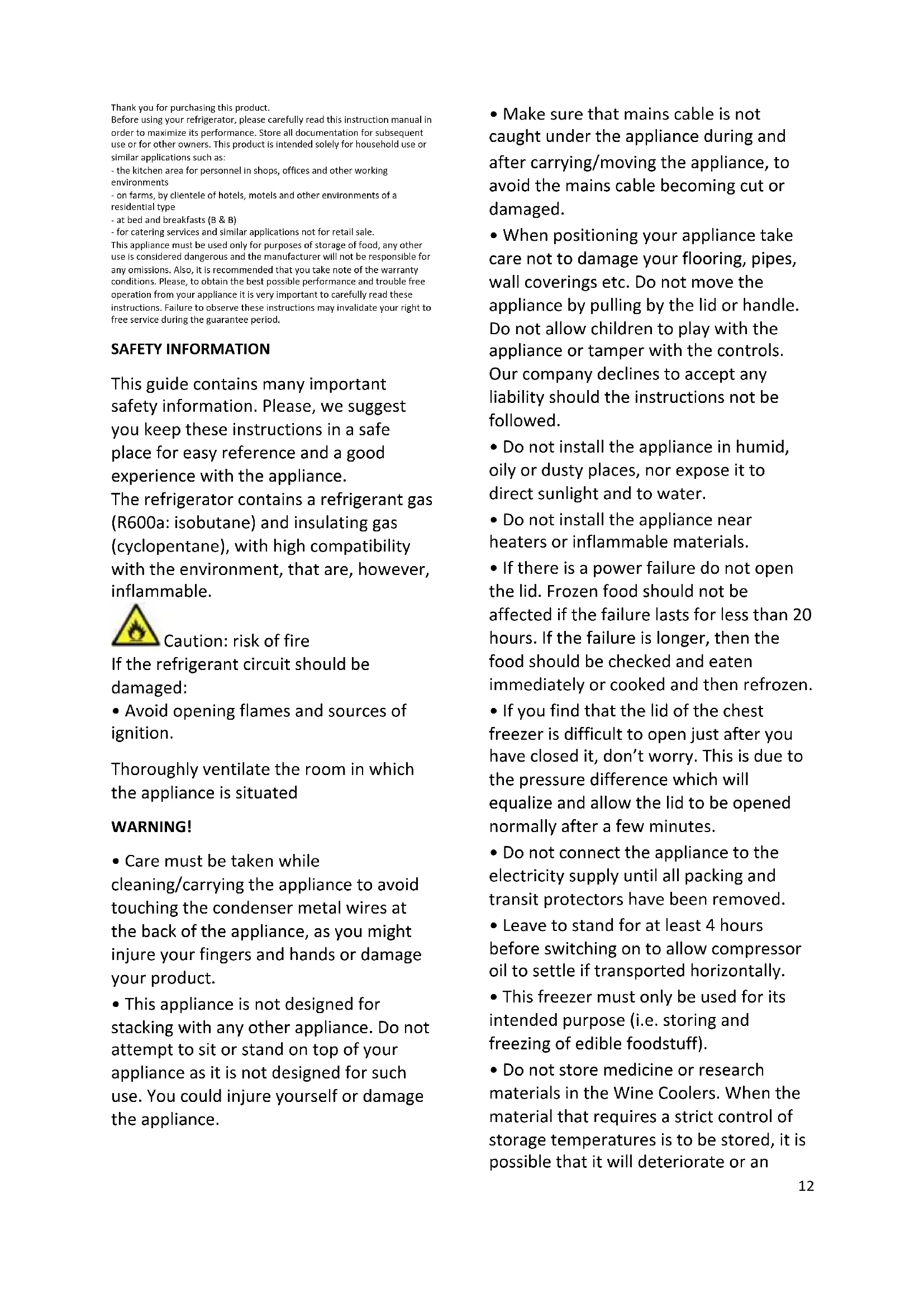 - Do not dispose of the appliance on a fire. Take care not to damage, the cooling circuit/pipes of the appliance in transportation and in use. In case of damage do not expose the appliance to fire, potential ignition source and immediately ventilate the room where the appliance is situated.