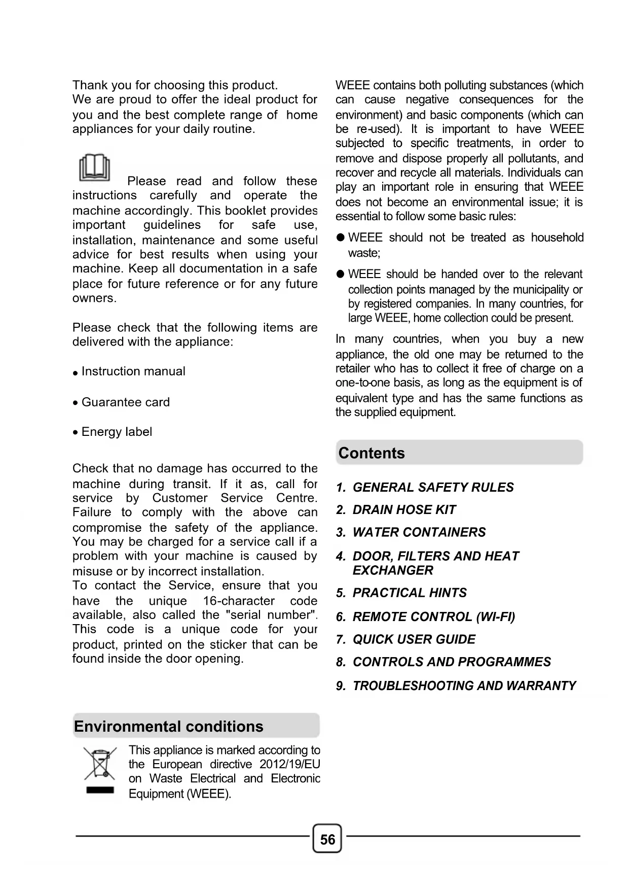 Please read and follow these instructions carefully and operate the machine accordingly. This booklet provides important guidelines for safe use, installation, maintenance and some useful advice for best results when using your machine. Keep all documentation in a safe place for future reference or for any future owners.