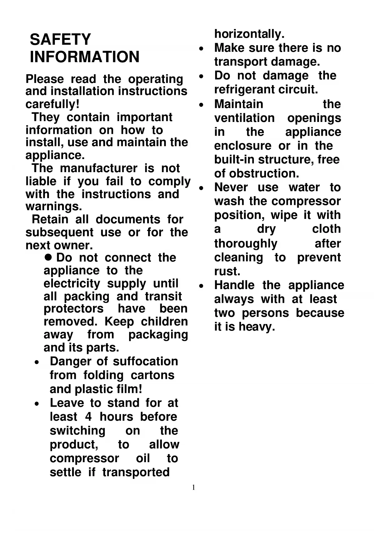FOR appliances with a freezer compartment: never put frozen food straight from the freezer compartment in your mouth. Risk of low- temperature burns!