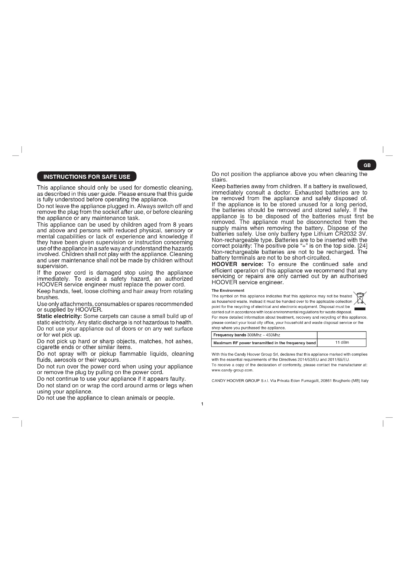 This appliance should only be used for domestic cleaning, as described in this user guide. Please ensure that this guide is fully understood before operating the appliance. Do not leave the appliance plugged in. Always switch off and remove the plug from the socket after use, or before cleaning the appliance or any maintenance task. This appliance can be used by children aged from 8 years and above and persons with reduced physical, sensory or mental capabilities or lack of experience and knowledge if they have been given supervision or instruction concerning use of the appliance in a safe way and understand the hazards involved. Children shall not play with the appliance. Cleaning and user maintenance shall not be made by children without supervision. If the power cord is damaged stop using the appliance immediately. To avoid a safety hazard, an authorized HOOVER service engineer must replace the power cord. Keep hands, feet, loose clothing and hair away from rotating brushes. Use only attachments, consumables or spares recommended or supplied by HOOVER. Static electricity: Some carpets can cause a small build up of static electricity. Any static discharge is not hazardous to health. Do not use your appliance out of doors or on any wet surface or for wet pick up. Do not pick up hard or sharp objects, matches, hot ashes, cigarette ends or other similar items. Do not spray with or pickup ammable liquids, cleaning uids, aerosols or their vapours. Do not run over the power cord when using your appliance or remove the plug by pulling on the power cord. Do not continue to use your appliance if it appears faulty. Do not stand on or wrap the cord around arms or legs when using your appliance. Do not use the appliance to clean animals or people. Do not position the appliance above you when cleaning the stairs. Keep batteries away from children. If a battery is swallowed, immediately consult a doctor. Exhausted batteries are to be removed from the appliance and safely disposed of. If the appliance is to be stored unused for a long period, the batteries should be removed and stored safely. If the appliance is to be disposed of the batteries must rst be removed. The appliance must be disconnected from the supply mains when removing the battery. Dispose of the batteries safely. Use only battery type Lithium CR2032 3V. Non-rechargeable type. Batteries are to be inserted with the correct polarity: The positive pole “+” is on the top side. [24] Non-rechargeable batteries are not to be recharged. The battery terminals are not to be short-circuited. HOOVER service: To ensure the continued safe and efcient operation of this appliance we recommend that any servicing or repairs are only carried out by an authorised HOOVER service engineer. The Environment The symbol on this appliance indicates that this appliance may not be treated as household waste. Instead it must be handed over to the applicable collection point for the recycling of electrical and electronic equipment. Disposal must be carried out in accordance with local environmental regulations for waste disposal. For more detailed information about treatment, recovery and recycling of this appliance, please contact your local city ofce, your household and waste disposal service or the shop where you purchased the appliance. With this the Candy Hoover Group Srl, declares that this appliance marked with complies with the essential requirements of the Directives 2014/53/EU and 2011/65/EU. To receive a copy of the declaration of conformity, please contact the manufacturer at: www.candy-group.com. CANDY HOOVER GROUP S.r.l. Via Privata Eden Fumagalli, 20861 Brugherio (MB) Italy