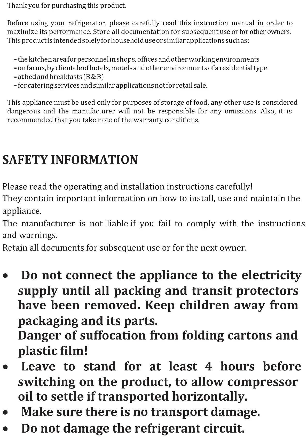 &RQWHQW 6DIHW\,QIRUPDWLRQ 3DJHa 2YHUYLHZ 3DJH ,QVWDOODWLRQ 3DJHa 8VHULQWHUIDFH 3DJHa 'DLO\8VH 3DJHaThank you for purchasing this product. Before using your refrigerator, please carefully read this instruction manual in order to maximize its performance. Store all documentation for subsequent use or for other owners. This product is intended solely for household use or similar applications such as: - t h e k i t c h e n a r e a f o r p e r s o n n e l i n s h o p s , o f f i c e s a n d o t h e r w o r k ing environments - on farms, by clientele of hotels, motels and other environments of a residential type - a t b e d a n d b r e a k f a s t s ( B & B ) - f o r c a t e r i n g s e r v i c e s a n d s i m i l a r a p p l i c a t i o n s n o t f o r r e t a i l s ale. This appliance must be used only for purposes of storage of food, any other use is considered dangerous and the manufacturer will not be responsible for any omissions. Also, it is recommended that you take note of the warranty conditions. SAFETY INFORMATION Please read the operating and installation instructions carefully! They contain important information on how to install, use and maintain the appliance. The manufacturer is not liable if you fail to comply with the instructions and warnings. Retain all documents for subsequent use or for the next owner. x Do not connect the appliance to the electricity supply until all packing and transit protectors have been removed. Keep children away from packaging and its parts. Danger of suffocation from folding cartons and plastic film! x Leave to stand for at least 4 hours before switching on the product, to allow compressor oil to settle if transported horizontally. x Make sure there is no transport damage. x Do not damage the refrigerant circuit. 1x Maintain the ventilation openings in the appliance enclosure or in the built-in structure, free of obstruction. x Never use water to wash the compressor position, wipe it with a dry cloth thoroughly after cleaning to prevent rust. x Handle the appliance always with at least two persons because it is heavy. x Install and level the appliance in an area suitable for its size and use. x Make sure that the electrical information on the rating plate agrees with the power supply. If it does not, contact an electrician. x The appliance is operated by a 220-240 VAC/50 Hz power supply. Abnormal voltage fluctuation may cause the appliance to fail to start, or damage to the temperature control or compressor, or there may be an abnormal noise when operating. In such case, an automatic regulator shall be mounted. x Only for UK: The appliance’s power cable is fitted with 3-cord (grounding) plug that fits a standard 3-cord (grounded) socket. Never cut off or dismount the third pin (grounding). After the appliance is installed, the plug should be accessible. x Make sure that mains cable is not caught under the appliance during and after 2carrying/moving the appliance, to avoid the mains cable becoming cut or damaged. If the supply cord is damaged, it must be replaced by the manufacturer, its service agent or similarly qualified person in order to avoid a hazard. x Do not install the appliance in humid, oily or dusty places, nor expose it to direct sunlight and to water. x Do not install the appliance near heaters or inflammable materials. x FOR appliances with a freezer compartment: if there is a power failure do not open the lid. Frozen food should not be affected if the failure lasts for less than the hours indicated on the rating label (Temperature rise time). If the failure is longer, then the food should be checked and eaten immediately or cooked and then refrozen. x If you find that the lid of the appliance is difficult to open just after you have closed it, don’t worry. This is due to the pressure difference which will equalize and allow the lid to be opened normally after a few minutes. x Do not store medicines, bacteria or chemical agents in the appliance. This appliance is a household appliance, it is not recommended to store materials that require strict temperatures. x Do not excessively pull or fold the power cord 3or touch the plug with wet hands. x Do not store products which contain flammable propellant (e.g. spray cans) or explosive substances in the appliance. Risk of explosion! x Do not place unstable articles (heavy objects, containers filled with water) on top of the refrigerator, to ovoid personal injury caused by falling or electric shock caused by contact with water. x Do not use electrical appliances inside the food storage compartments, unless they are of the type recommended by the manufacturer. x Do not touch internal cooling elements, especially with wet hands, to avoid cracks or injuries. x At risk here are children, people who have limited physical, mental or sensory abilities, as well as people who have inadequate knowledge concerning safe operation of the appliance. x Check that children and vulnerable people have understood the hazards. A person responsible for safety must supervise or instruct children and vulnerable people who are using the appliance. Only children aged 8 years and above may use the appliance. x Children should not play with the appliance. 4x Children aged from 3 to 8 years are allowed to load and unload this appliance. x FOR appliances with a freezer compartment: do not store bottled or canned liquids (especially carbonated drinks) in the freezer compartment. Bottles and cans may burst! x FOR appliances with a freezer compartment: never put frozen food straight from the freezer compartment in your mouth. Risk of low- temperature burns! x Keep plastic parts and the door seal free of oil and grease. Otherwise, plastic parts and the door seal will become porous. x Before performing any operation, unplug the power cord from the power socket. x Do not use mechanical devices or other means to accelerate the defrosting process, other than those recommended by the manufacturer. x Do not use pointed or s