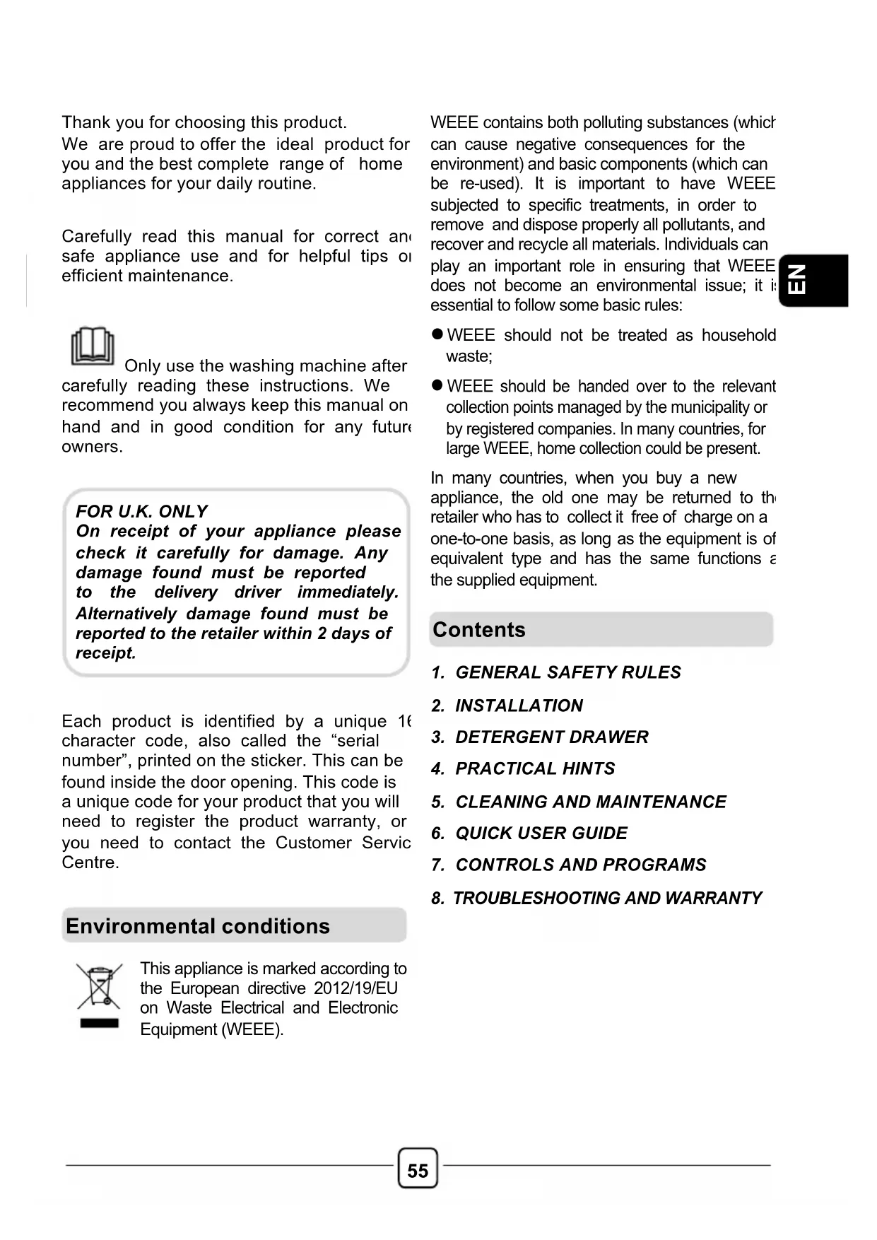 On receipt of your appliance please check it carefully for damage. Any damage found must be reported to the delivery driver immediately. Alternatively damage found must be reported to the retailer within 2 days of receipt. Environmental conditions Contents!