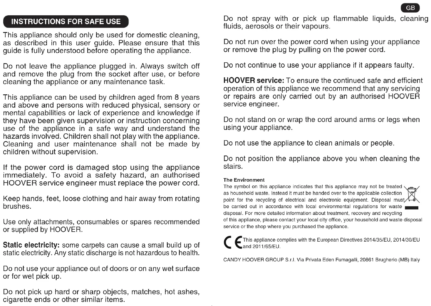 This appliance should only be used for domestic cleaning, as described in this user guide. Please ensure that this guide is fully understood before operating the appliance. Do not leave the appliance plugged in. Always switch off and remove the plug from the socket after use, or before cleaning the appliance or any maintenance task. This appliance can be used by children aged from 8 years and above and persons with reduced physical, sensory or mental capabilities or lack of experience and knowledge if they have been given supervision or instruction concerning use of the appliance in a safe way and understand the hazards involved. Children shall not play with the appliance. Cleaning and user maintenance shall not be made by children without supervision. If the power cord is damaged stop using the appliance immediately. To avoid a safety hazard, an authorised HOOVER service engineer must replace the power cord. Keep hands, feet, loose clothing and hair away from rotating brushes. Use only attachments, consumables or spares recommended or supplied by HOOVER. Static electricity: some carpets can cause a small build up of static electricity. Any static discharge is not hazardous to health. Do not use your appliance out of doors or on any wet surface or for wet pick up. Do not pick up hard or sharp objects, matches, hot ashes, cigarette ends or other similar items. Do not spray with or pick up ammable liquids, cleaning uids, aerosols or their vapours. Do not run over the power cord when using your appliance or remove the plug by pulling on the power cord. Do not continue to use your appliance if it appears faulty. HOOVER service: To ensure the continued safe and efcient operation of this appliance we recommend that any servicing or repairs are only carried out by an authorised HOOVER service engineer. Do not stand on or wrap the cord around arms or legs when using your appliance. Do not use the appliance to clean animals or people. Do not position the appliance above you when cleaning the stairs. The Environment The symbol on this appliance indicates that this appliance may not be treated as household waste. Instead it must be handed over to the applicable collection point for the recycling of electrical and electronic equipment. Disposal must be carried out in accordance with local environmental regulations for waste disposal. For more detailed information about treatment, recovery and recycling of this appliance, please contact your local city ofce, your household and waste disposal service or the shop where you purchased the appliance. This appliance complies with the European Directives 2014/35/EU, 2014/30/EU and 2011/65/EU. CANDY HOOVER GROUP S.r.l. Via Privata Eden Fumagalli, 20861 Brugherio (MB) Italy GB2 *Certain Models Only **Nozzle design may vary according to models