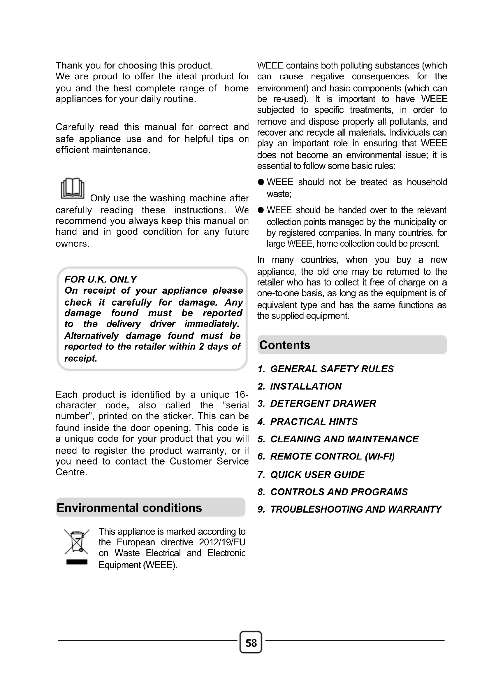 Only use the washing machine after carefully reading these instructions. We recommend you always keep this manual on hand and in good condition for any future owners.