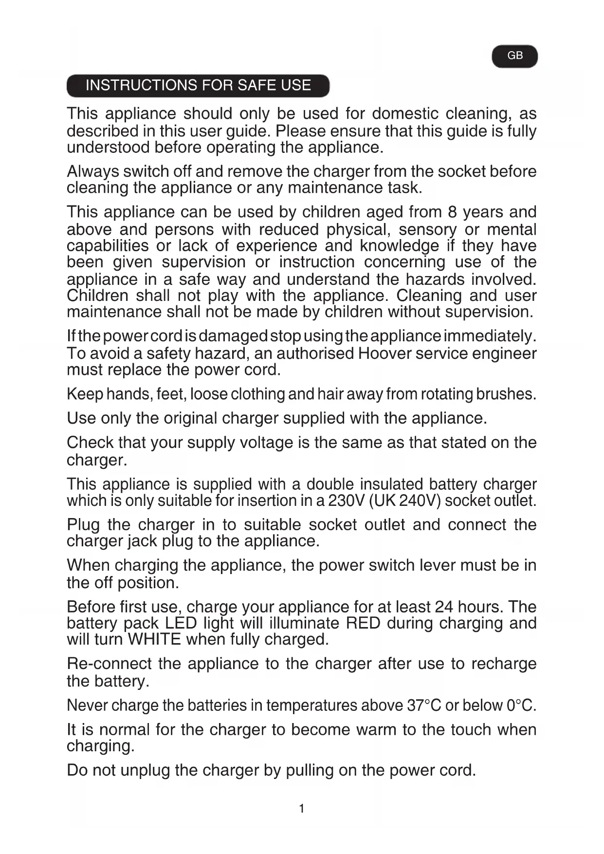 This appliance should only be used for domestic cleaning, as described in this user guide. Please ensure that this guide is fully understood before operating the appliance. Always switch off and remove the charger from the socket before cleaning the appliance or any maintenance task. This appliance can be used by children aged from 8 years and above and persons with reduced physical, sensory or mental capabilities or lack of experience and knowledge if they have been given supervision or instruction concerning use of the appliance in a safe way and understand the hazards involved. Children shall not play with the appliance. Cleaning and user maintenance shall not be made by children without supervision. If the power cord is damaged stop using the appliance immediately. To avoid a safety hazard, an authorised Hoover service engineer must replace the power cord. Keep hands, feet, loose clothing and hair away from rotating brushes. Use only the original charger supplied with the appliance. Check that your supply voltage is the same as that stated on the charger. This appliance is supplied with a double insulated battery charger which is only suitable for insertion in a 230V (UK 240V) socket outlet. Plug the charger in to suitable socket outlet and connect the charger jack plug to the appliance. When charging the appliance, the power switch lever must be in the off position. Before first use, charge your appliance for at least 24 hours. The battery pack LED light will illuminate RED during charging and will turn WHITE when fully charged. Re-connect the appliance to the charger after use to recharge the battery. Never charge the batteries in temperatures above 37°C or below 0°C. It is normal for the charger to become warm to the touch when charging. Do not unplug the charger by pulling on the power cord. GB2 Unplug the charger in the event of prolonged absence (holidays, etc.). Recharge appliance again before use as batteries may self discharge over increased periods of storage. If the appliance is to be disposed of the batteries must first be removed. The appliance must be disconnected from the supply mains when removing the battery. Dispose of the batteries safely. Run the appliance until it stops because the batteries are fully discharged. Used batteries should be taken to a recycling station and not disposed of with household waste. To remove the batteries, please contact the Hoover Customer Centre or proceed according to the following instructions. IMPORTANT: Always fully discharge the batteries before removal. Run the cleaner until the batteries are completely empty. Remove the charger jack plug from the appliance. Press the battery pack release buttons and slide to remove. [11] NOTE: Should you experience any difficulty in dismantling the unit or for more detailed information on treatment, recovery and recycling of this appliance, please contact your local city office or your household waste disposal service. Use only attachments, consumables or spares recommended or supplied by Hoover. Static electricity: Some carpets can cause a small build up of static electricity. Any static discharge is not hazardous to health. Do not use your appliance out of doors or on any wet surface or for wet pick up. Do not pick up hard or sharp objects, matches, hot ashes, cigarette ends or other similar items. Do not spray with or pick up flammable liquids, cleaning fluids, aerosols or their vapours. Do not run over the power cord when using your appliance or remove the plug by pulling on the power cord. Do not continue to use your appliance or charger if it appears faulty. Hoover service: To ensure the continued safe and efficient operation of this appliance we recommend that any servicing or repairs are only carried out by an authorised Hoover service engineer. GBPRODUCT COMPONENTS