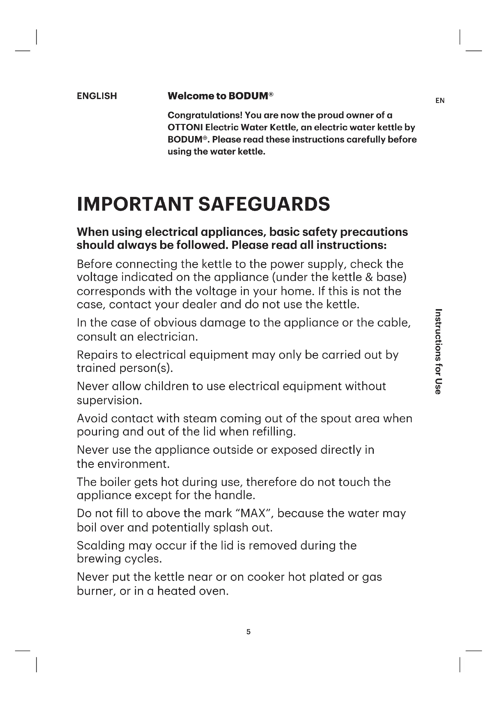 Congratulations! You are now the proud owner of a OTTONI Electric Water Kettle, an electric water kettle by BODUM®. Please read these instructions carefully before using the water kettle.