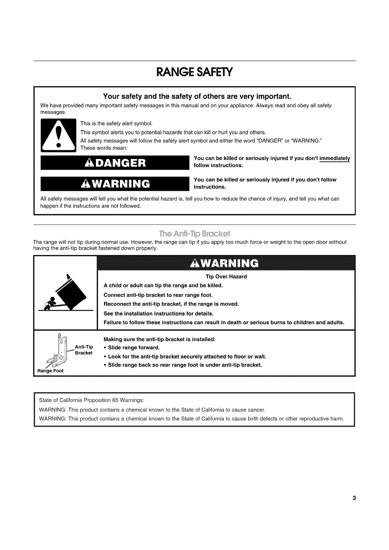 Liste d'accessoires.....................................................................61 GARANTIE.....................................................................................623 RANGE SAFETY The Anti-Tip Bracket The range will not tip during normal use. However, the range can tip if you apply too much force or weight to the open door without having the anti-tip bracket fastened down properly.You can be killed or seriously injured if you don't immediately You can be killed or seriously injured if you don'tfollow All safety messages will tell you what the potential hazard is, tell you how to reduce the chance of injury, and tell you what can happen if the instructions are not followed. Your safety and the safety of others are very important. We have provided many important safety messages in this manual and on your appliance. Always read and obey all safety messages.This is the safety alert symbol.This symbol alerts you to potential hazards that can kill or hurt you and others.All safety messages will follow the safety alert symbol and either the word “DANGER” or “WARNING.”These words mean:follow instructions.instructions. DANGER WARNING Tip Over HazardA child or adult can tip the range and be killed.Connect anti-tip bracket to rear range foot.Reconnect the anti-tip bracket, if the range is moved.See the installation instructions for details.Failure to follow these instructions can result in death or serious burns to children and adults.Anti-TipBracketMaking sure the anti-tip bracket is installed:• Slide range forward.• Look for the anti-tip bracket securely attached to floor or wall.• Slide range back so rear range foot is under anti-tip bracket.Range Foot WARNING State of California Proposition 65 Warnings:WARNING: This product contains a chemical known to the State of California to cause cancer. WARNING: This product contains a chemical known to the State of California to cause birth defects or other reproductive harm.4