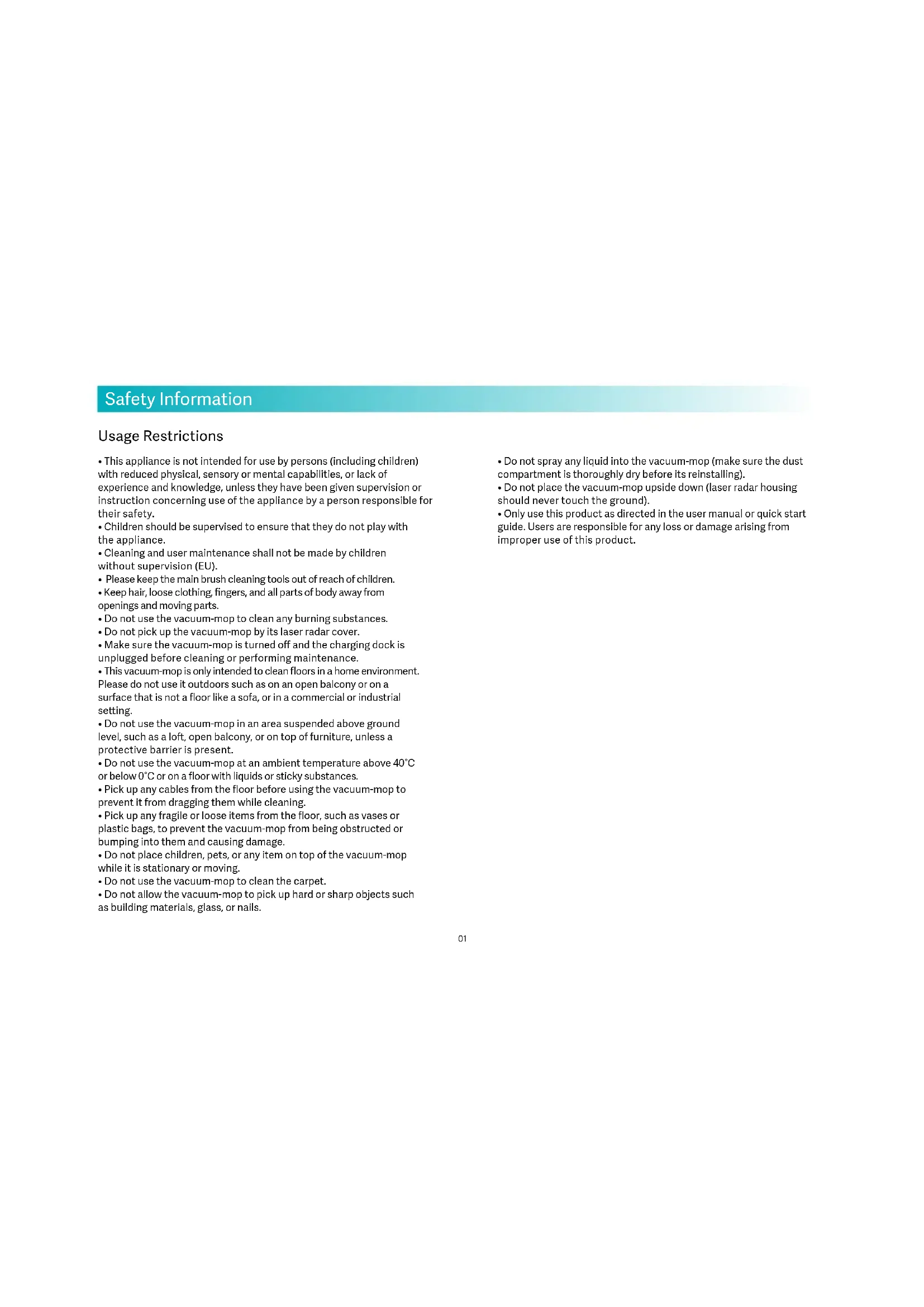 - If the vacuum-mop will not be used for an extended period, fully charge it, then turn it off and store it in a cool, dry place. Recharge the vacuum-mop at least once a month to prevent baery damage. This product's laser radar meets the IEC 60825-1:2014 Standard for Class 1 laser product safety and does not produce laser radiation hazardous to the human body. Baeries and Charging