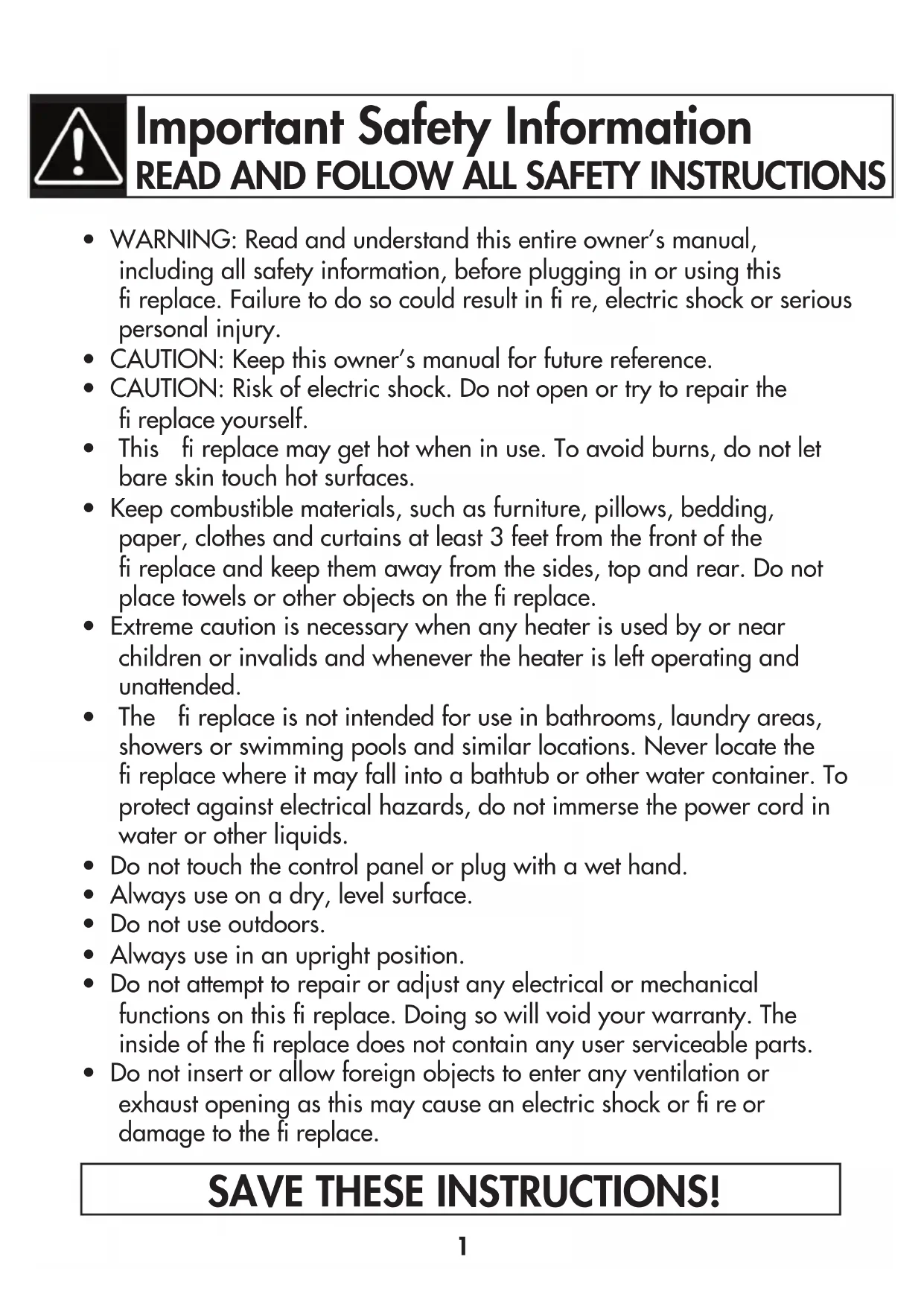- WARNING: Read and understand this entire owner’s manual, including all safety information, before plugging in or using this fi replace. Failure to do so could result in fi re, electric shock or serious personal injury.