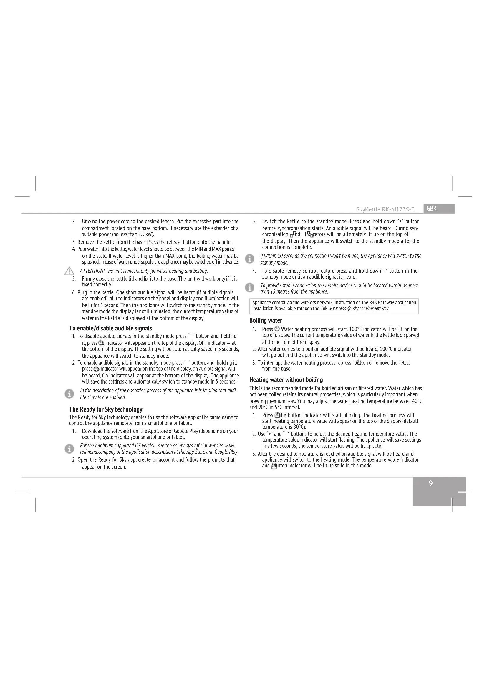 To disable remote control feature press and hold down “–” button in the standby mode until an audible signal is heard. To provide stable connection the mobile device should be located within no more than 15 metres from the appliance. Appliance control via the wireless network. Instruction on the R4S Gateway application installation is available through the link: www.readyforsky.com/r4sgateway Boiling water