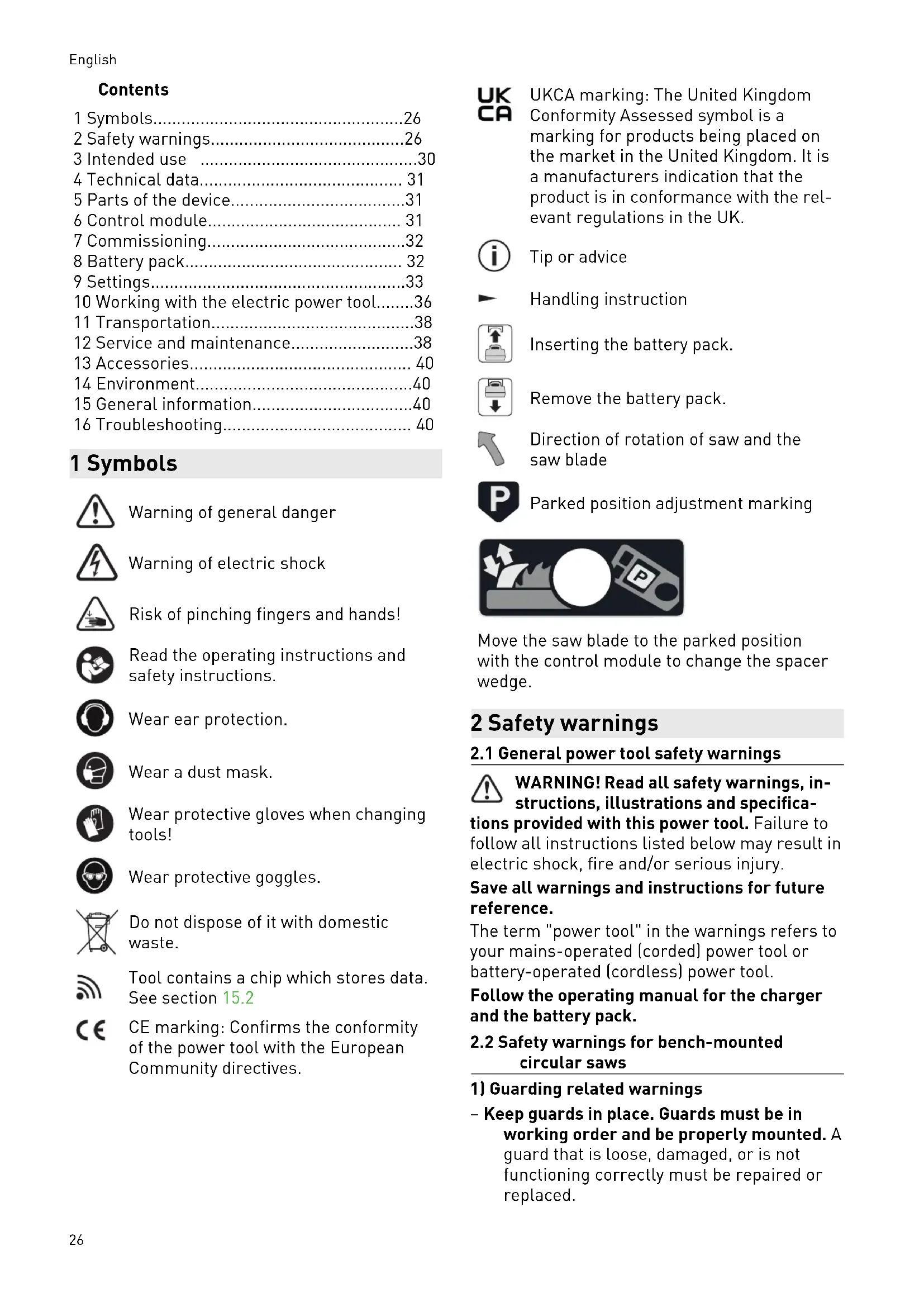 CE marking: Confirms the conformity of the power tool with the European Community directives. UKCA marking: The United Kingdom Conformity Assessed symbol is a marking for products being placed on the market in the United Kingdom. It is a manufacturers indication that the product is in conformance with the rel evant regulations in the UK. Tip or advice Handling instruction Inserting the battery pack. Remove the battery pack. Direction of rotation of saw and the saw blade Parked position adjustment marking Move the saw blade to the parked position with the control module to change the spacer wedge. 2 Safety warnings