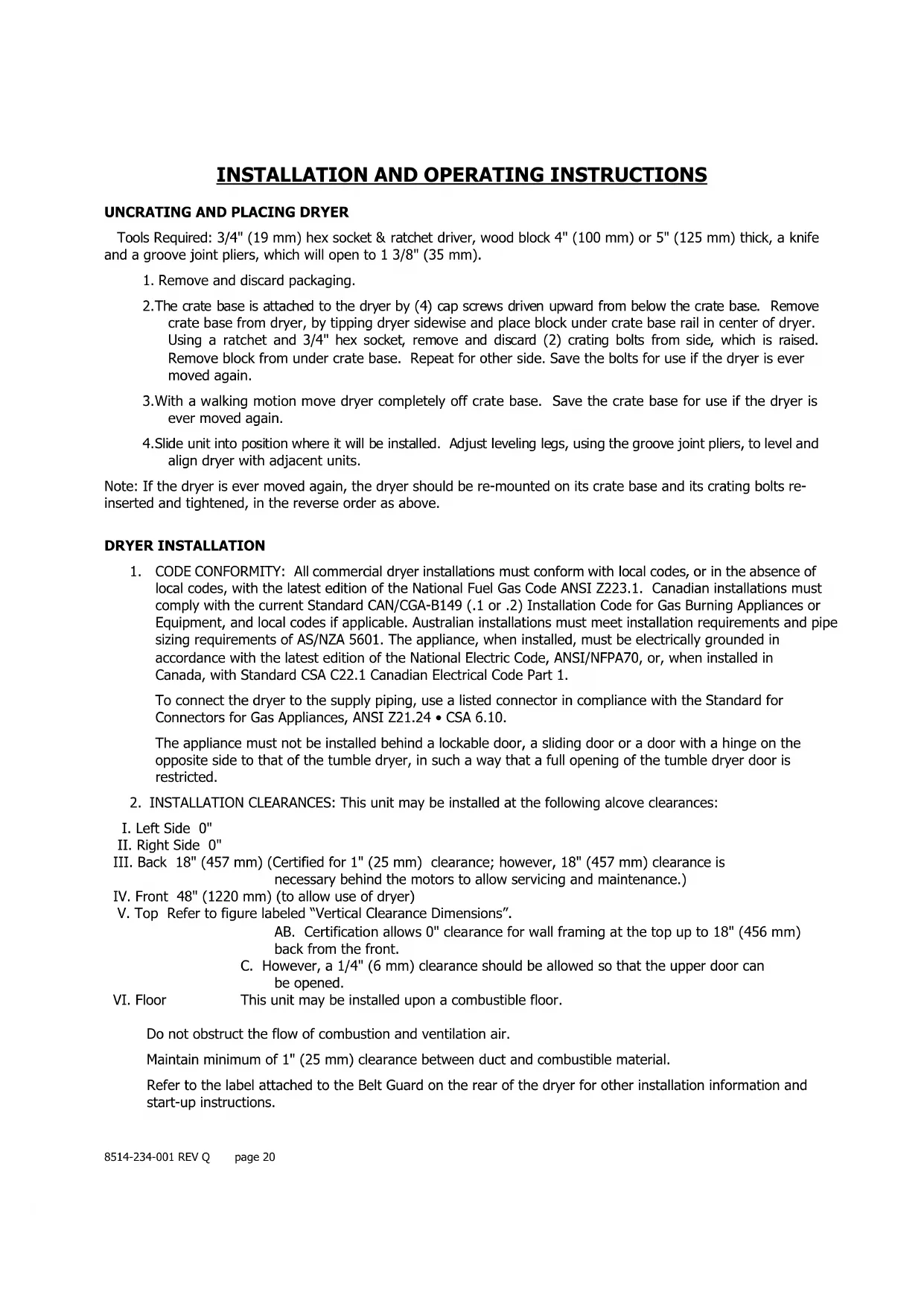 Do not obstruct the flow of combustion and ventilation air. Maintain minimum of 1" (25 mm) clearance between duct and combustible material. Refer to the label attached to the Belt Guard on the rear of the dryer for other installation information and start-up instructions.8514-234-001 REV Q page 21