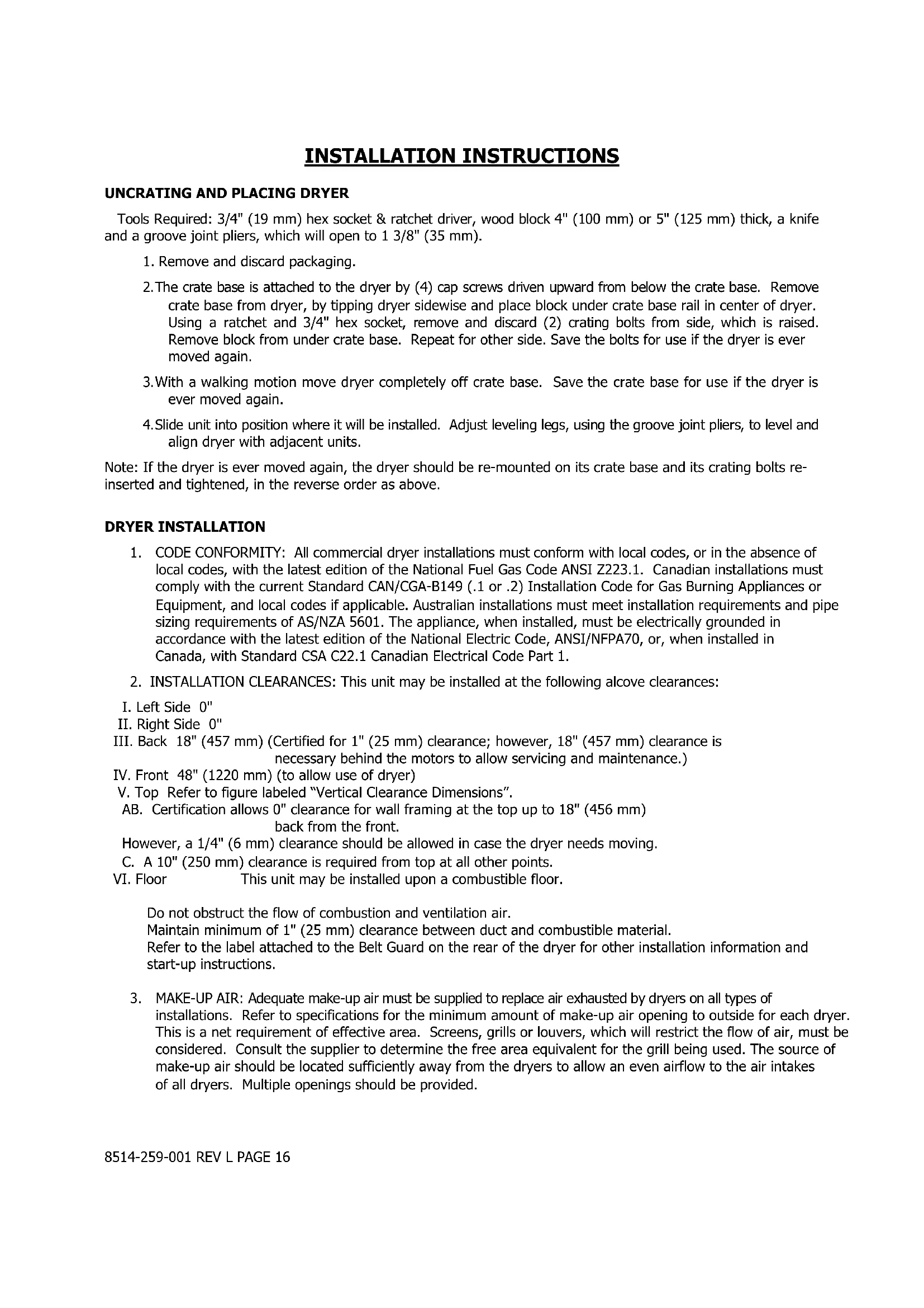 installations. Refer to specifications for the minimum amount of make-up air opening to outside for each dryer. This is a net requirement of effective area. Screens, grills or louvers, which will restrict the flow of air, must be considered. Consult the supplier to determine the free area equivalent for the grill being used. The source of make-up air should be located sufficiently away from the dryers to allow an even airflow to the air intakes of all dryers. Multiple openings should be provided.8514-259-001 REV L PAGE 17 The sources of all make-up air and room ventilation air movement to all dryers must be located away from any dry cleaners. This is necessary so that solvent vapors will not be drawn into the dryer inlet ducts. Dry cleaner solvent vapors will decompose in contact with open flame such as the gas flame present in clothes dryers. The decomposition products are highly corrosive and will cause damage to the dryer(s) ducts and clothes loads.