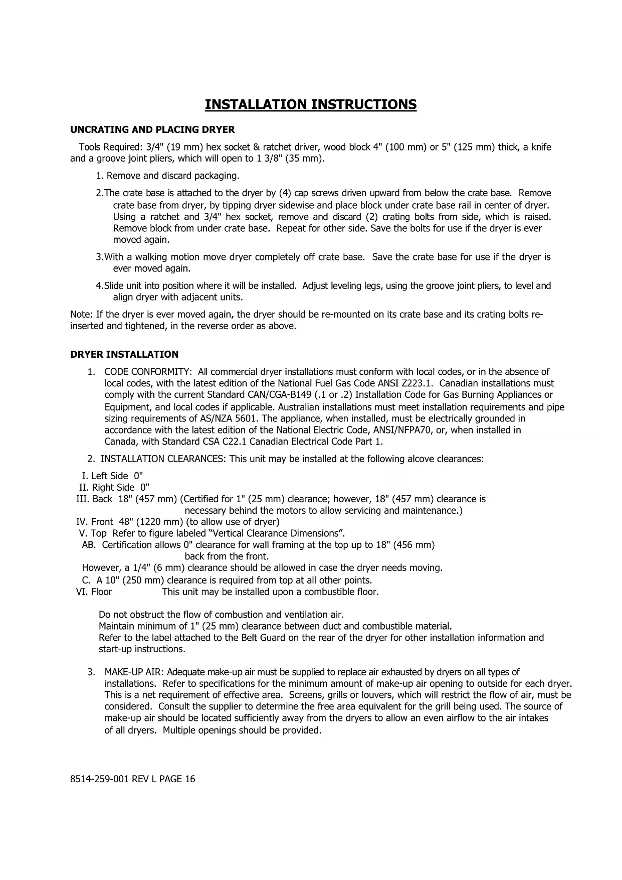 installations. Refer to specifications for the minimum amount of make-up air opening to outside for each dryer. This is a net requirement of effective area. Screens, grills or louvers, which will restrict the flow of air, must be considered. Consult the supplier to determine the free area equivalent for the grill being used. The source of make-up air should be located sufficiently away from the dryers to allow an even airflow to the air intakes of all dryers. Multiple openings should be provided.8514-259-001 REV L PAGE 17 The sources of all make-up air and room ventilation air movement to all dryers must be located away from any dry cleaners. This is necessary so that solvent vapors will not be drawn into the dryer inlet ducts. Dry cleaner solvent vapors will decompose in contact with open flame such as the gas flame present in clothes dryers. The decomposition products are highly corrosive and will cause damage to the dryer(s) ducts and clothes loads.