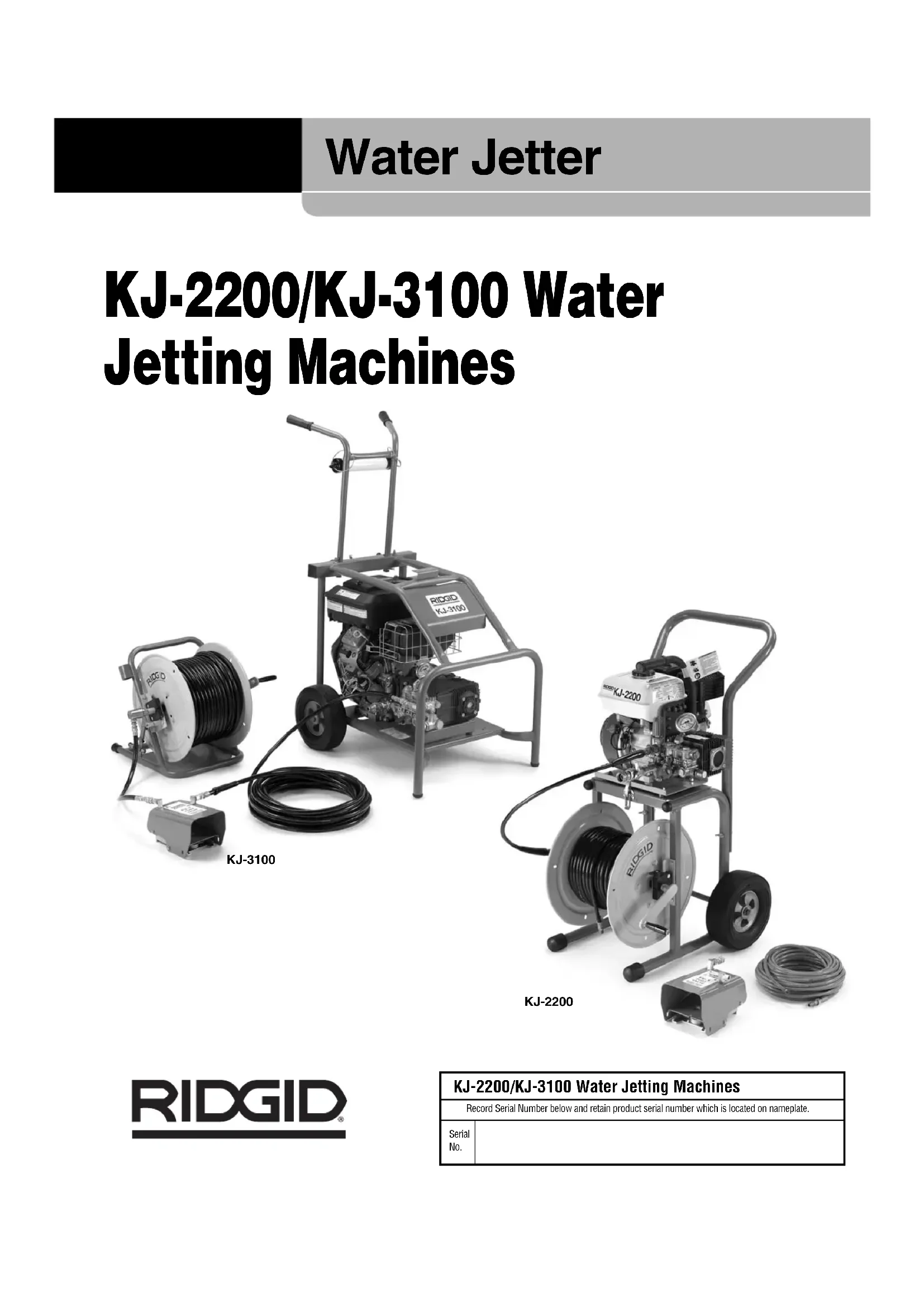 prod- uct: – Contact your local RIDGID distributor. – Visit www.RIDGID.com or www.RIDGID.eu to find your local RIDGID contact point.4 KJ-2200/KJ-3100 Water Jetting Machines Figure 2 – KJ-3100 Water Jetting Machine Figure 3 – Machine Serial Number The machine serial number is located on the frame. The last 4 digits indicate the month and year of the manufac- ture. (08 = month, 10 = year). – Contact RIDGID Technical Services Department at rtctechservices@emerson.com, or in the U.S. and Canada call (800) 519-3456. Description, Specifications and Standard Equipment Description The RIDGID
