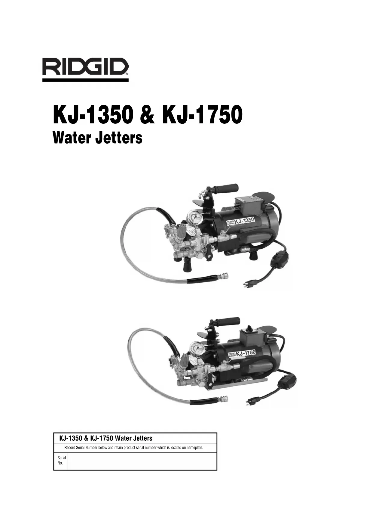 - When servicing a tool, use only identical replace- ment parts. Follow instructions in the Maintenance Section of this manual. Use of unauthorized parts or failure to follow maintenance instructions may create a risk of electrical shock or injury. Specific Safety Information WARNING Read this operator’s manual carefully before using the RIDGID KJ-1350 or KJ-1750 Water Jetters. Failure to understand and follow the contents of this manual may result in electrical shock, fire and/or serious personal injury. Call the Ridge Tool Company, Technical Service Depart- ment at (800) 519-3456 if you have any questions. Jetter Safety