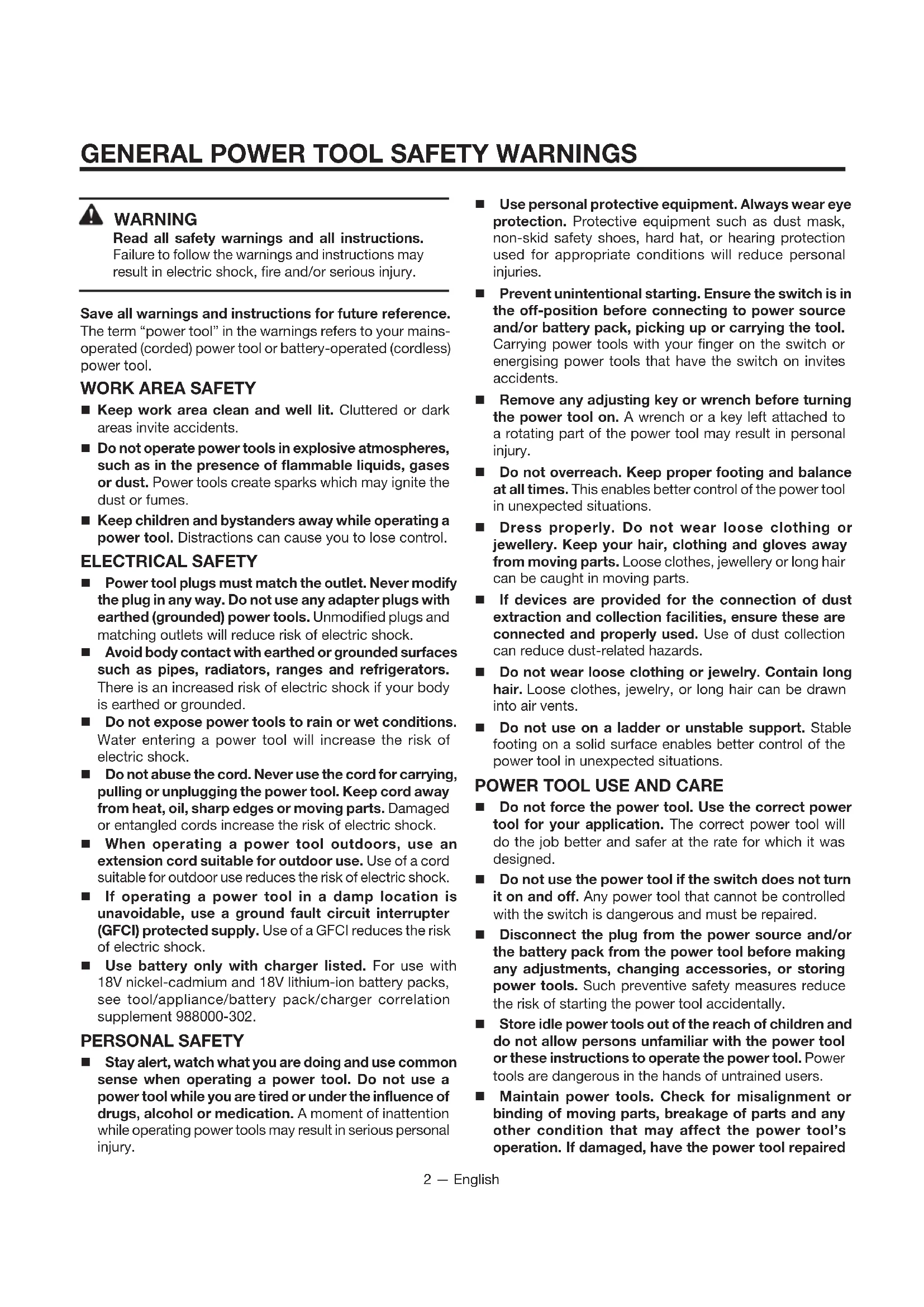 Keep children and bystanders away while operating a power tool. Distractions can cause you to lose control. ELECTRICAL SAFETY Power tool plugs must match the outlet. Never modify the plug in any way. Do not use any adapter plugs with earthed (grounded) power tools. Unmodified plugs and matching outlets will reduce risk of electric shock. Avoid body contact with earthed or grounded surfaces such as pipes, radiators, ranges and refrigerators. There is an increased risk of electric shock if your body is earthed or grounded. Do not expose power tools to rain or wet conditions. Water entering a power tool will increase the risk of electric shock. Do not abuse the cord. Never use the cord for carrying, pulling or unplugging the power tool. Keep cord away from heat, oil, sharp edges or moving parts. Damaged or entangled cords increase the risk of electric shock. When operating a power tool outdoors, use an extension cord suitable for outdoor use. Use of a cord suitable for outdoor use reduces the risk of electric shock. If operating a power tool in a damp location is unavoidable, use a ground fault circuit interrupter (GFCI) protected supply. Use of a GFCI reduces the risk of electric shock. Use battery only with charger listed. For use with 18V nickel-cadmium and 18V lithium-ion battery packs, see tool/appliance/battery pack/charger correlation supplement 988000-302. PERSONAL SAFETY Stay alert, watch what you are doing and use common sense when operating a power tool. Do not use a power tool while you are tired or under the influence of drugs, alcohol or medication. A moment of inattention while operating power tools may result in serious personal injury. Use personal protective equipment. Always wear eye protection. Protective equipment such as dust mask, non-skid safety shoes, hard hat, or hearing protection used for appropriate conditions will reduce personal injuries. Prevent unintentional starting. Ensure the switch is in the off-position before connecting to power source and/or battery pack, picking up or carrying the tool. Carrying power tools with your finger on the switch or energising power tools that have the switch on invites accidents. Remove any adjusting key or wrench before turning the power tool on. A wrench or a key left attached to a rotating part of the power tool may result in personal injury. Do not overreach. Keep proper footing and balance at all times. This enables better control of the power tool in unexpected situations. Dress properly. Do not wear loose clothing or jewellery. Keep your hair, clothing and gloves away from moving parts. Loose clothes, jewellery or long hair can be caught in moving parts. If devices are provided for the connection of dust extraction and collection facilities, ensure these are connected and properly used. Use of dust collection can reduce dust-related hazards. Do not wear loose clothing or jewelry. Contain long hair. Loose clothes, jewelry, or long hair can be drawn into air vents. Do not use on a ladder or unstable support. Stable footing on a solid surface enables better control of the power tool in unexpected situations.