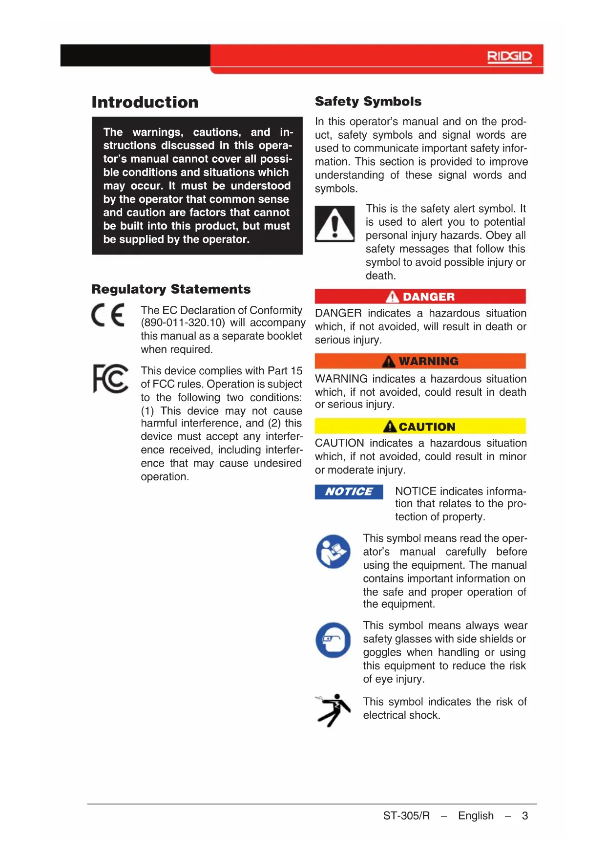 riers as necessary to keep bystanders away. See additional product specific safety in- formation and warnings starting on 9.ST-305/R – English – 7 Product Overview Description ST-305/R is used to refer to both the ST-305R and the ST-305 throughout this manual. The ST-305R and ST-305 are functionally identical. The only differ- ence is the ST-305R can be used with a rechargeable battery and internal C-cell batteries. The ST-305 is only operational with internal C-cell batteries. The RIDGID