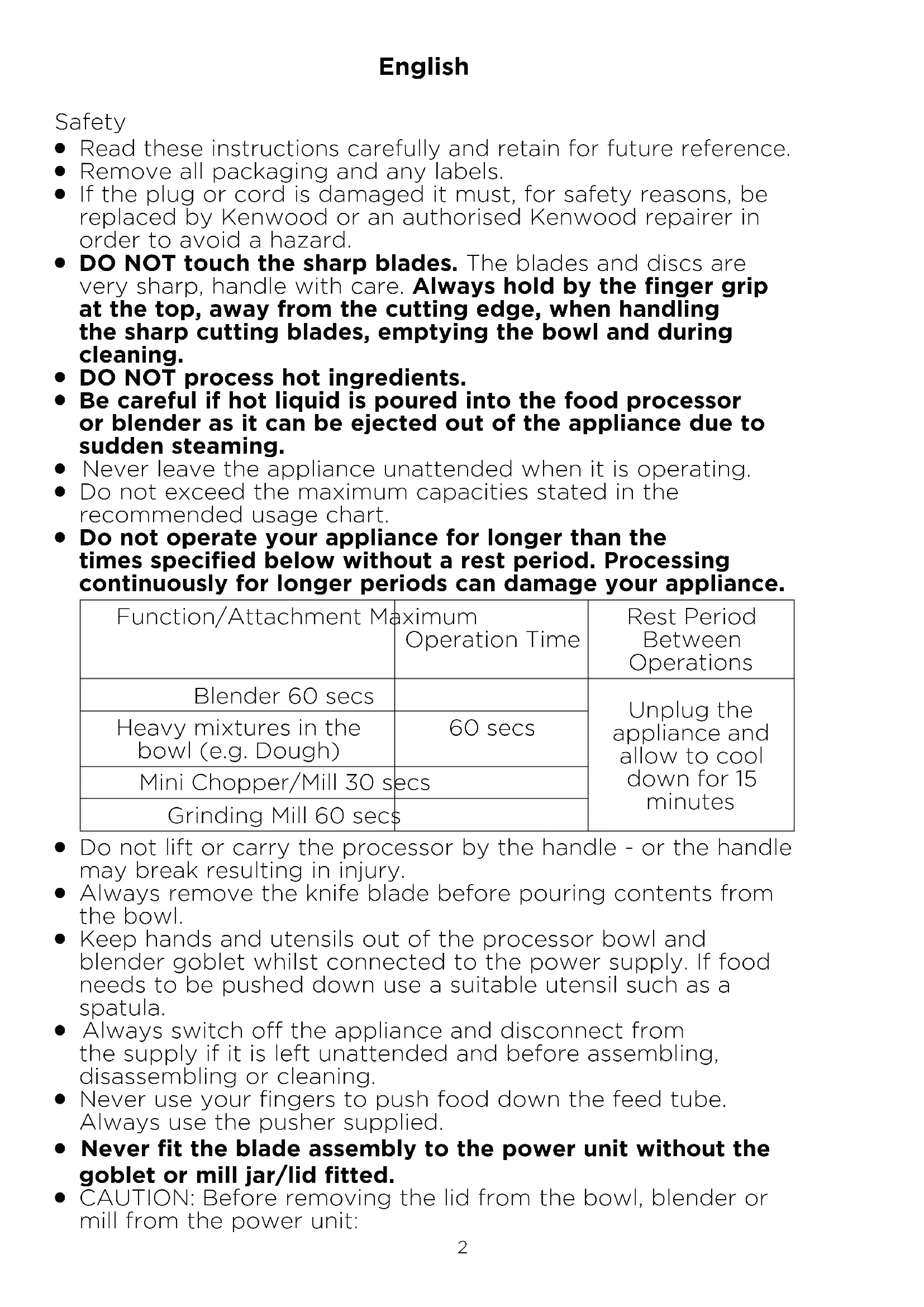 Do not operate your appliance for longer than the times specified below without a rest period. Processing continuously for longer periods can damage your appliance. Function/Attachment Maximum Operation Time Rest Period Between Operations Blender 60 secs Unplug the appliance and allow to cool down for 15 minutes Heavy mixtures in the bowl (e.g. Dough) 60 secs Mini Chopper/Mill 30 secs Grinding Mill 60 secs