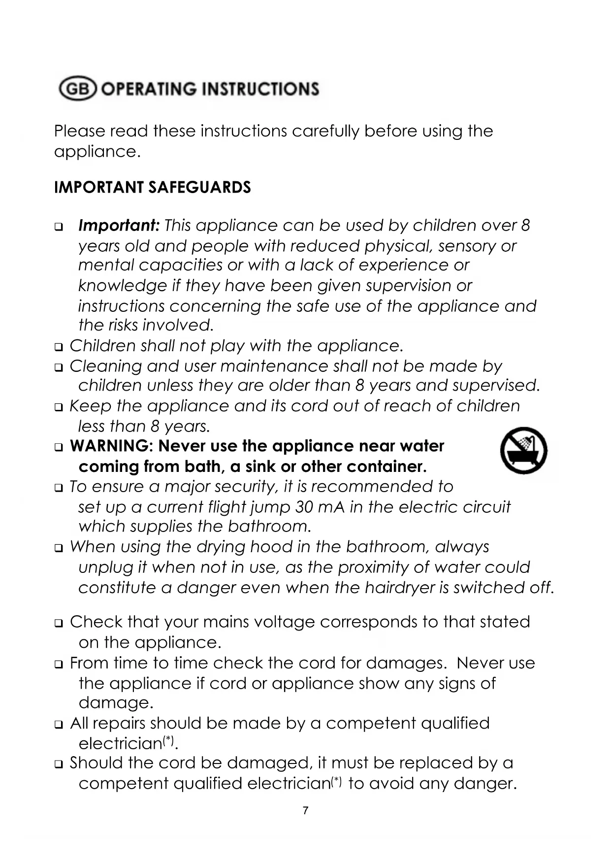 Please read these instructions carefully before using the appliance. IMPORTANT SAFEGUARDS Important: This appliance can be used by children over 8 years old and people with reduced physical, sensory or mental capacities or with a lack of experience or knowledge if they have been given supervision or instructions concerning the safe use of the appliance and the risks involved. Children shall not play with the appliance. Cleaning and user maintenance shall not be made by children unless they are older than 8 years and supervised. Keep the appliance and its cord out of reach of children less than 8 years.