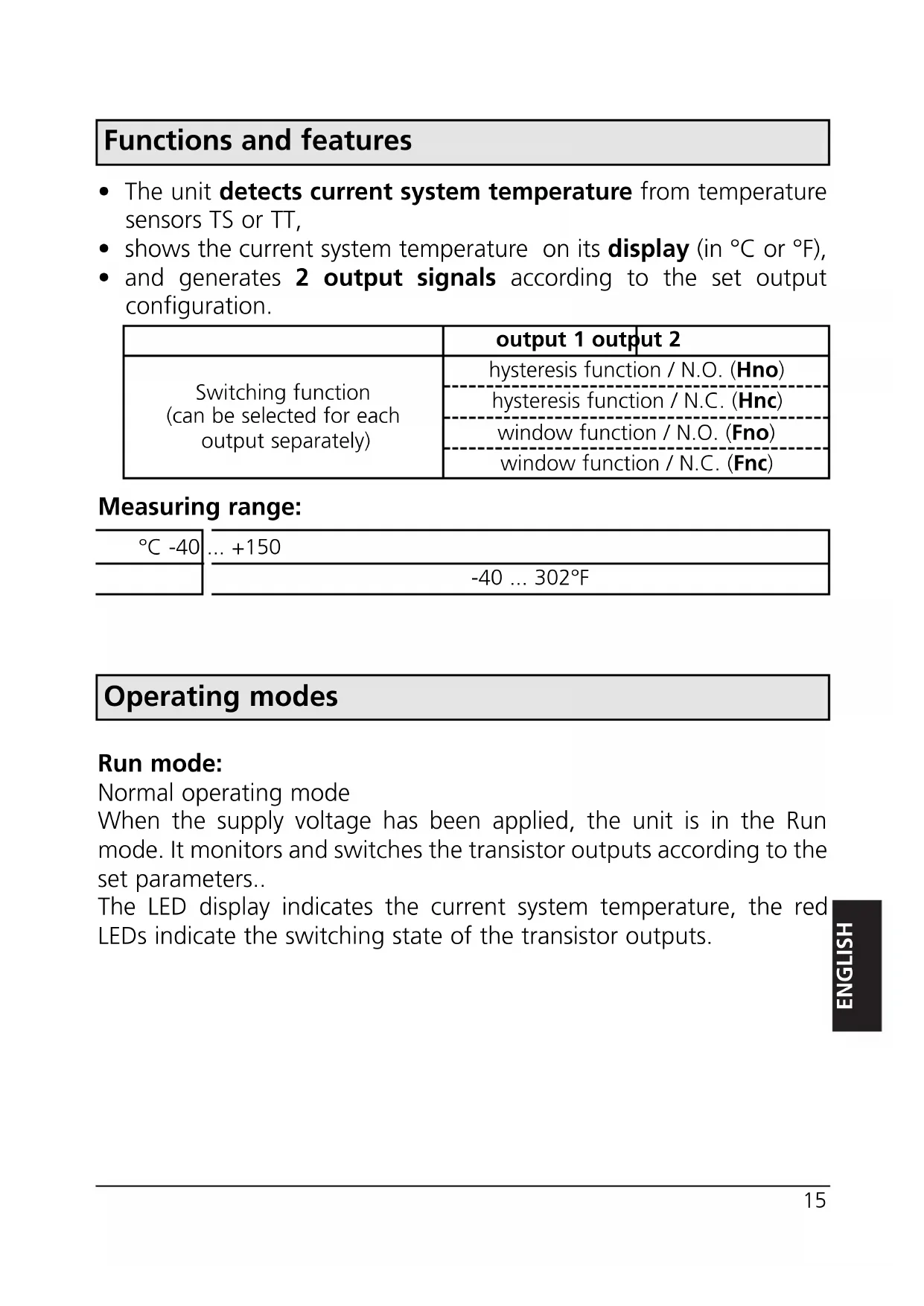 When the supply voltage has been applied, the unit is in the Run mode. It monitors and switches the transistor outputs according to the set parameters..