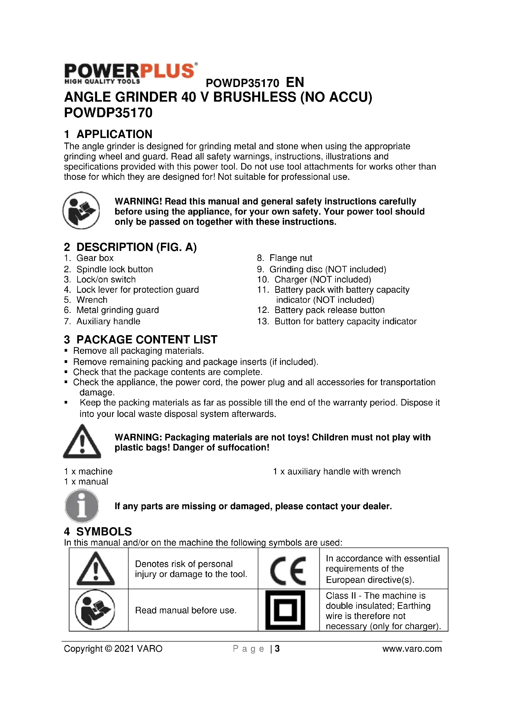 Class II - The machine is double insulated; Earthing wire is therefore not necessary (only for charger).POWDP35170 EN Copyright © 2021 VARO P a g e | 4 www.varo.com