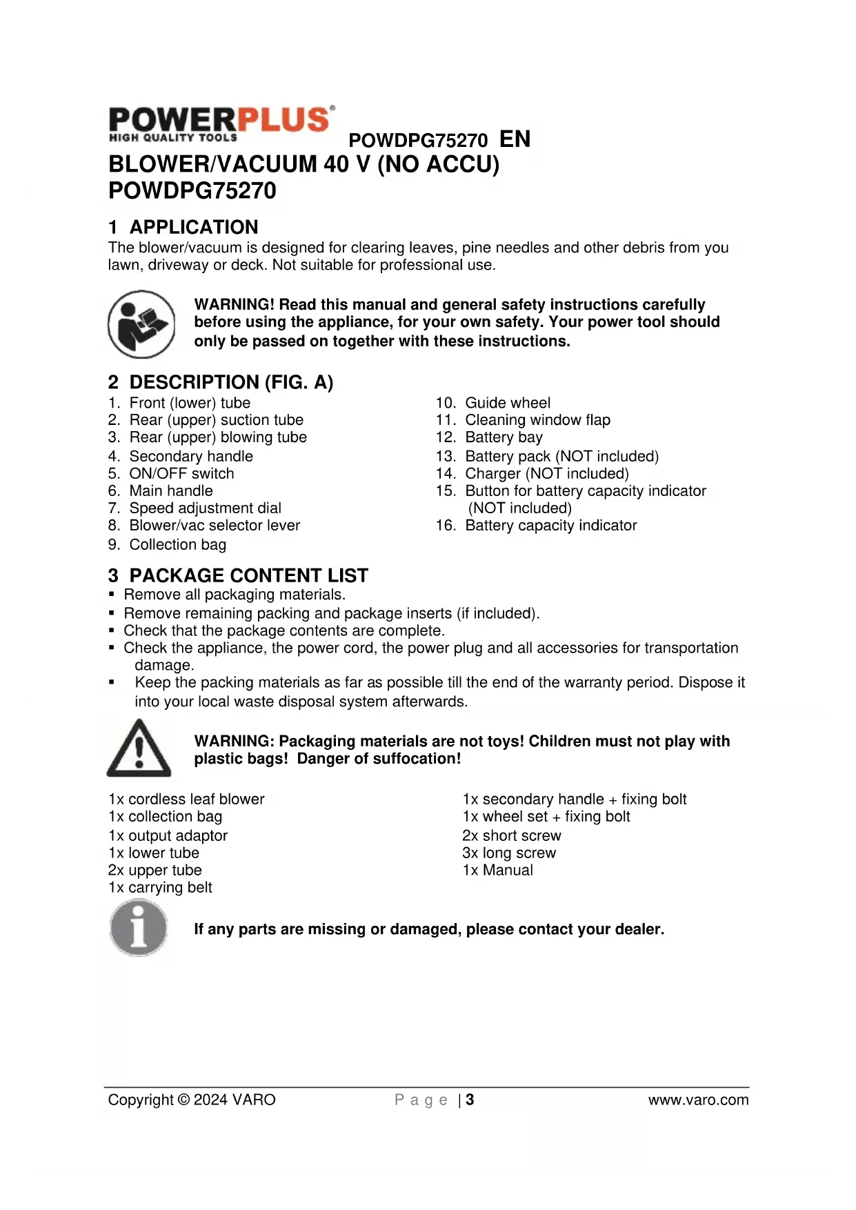 Copyright © 2024 VARO P a g e | 3 www.varo.com BLOWER/VACUUM 40 V (NO ACCU) POWDPG75270 1 APPLICATION The blower/vacuum is designed for clearing leaves, pine needles and other debris from you lawn, driveway or deck. Not suitable for professional use. WARNING! Read this manual and general safety instructions carefully before using the appliance, for your own safety. Your power tool should only be passed on together with these instructions. 2 DESCRIPTION (FIG. A)