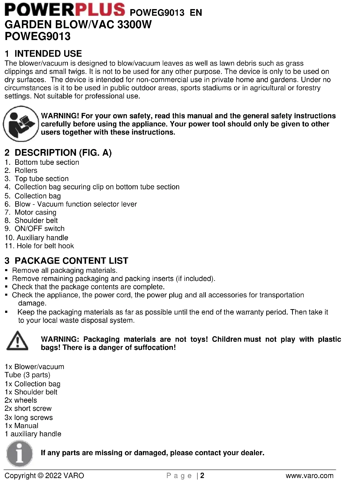 POWEG9013 1 INTENDED USE The blower/vacuum is designed to blow/vacuum leaves as well as lawn debris such as grass clippings and small twigs. It is not to be used for any other purpose. The device is only to be used on dry surfaces. The device is intended for non-commercial use in private home and gardens. Under no circumstances is it to be used in public outdoor areas, sports stadiums or in agricultural or forestry settings. Not suitable for professional use. WARNING! For your own safety, read this manual and the general safety instructions carefully before using the appliance. Your power tool should only be given to other users together with these instructions. 2 DESCRIPTION (FIG. A)