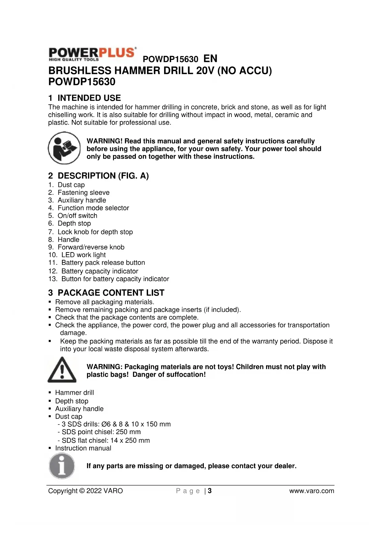 - When disposing of batteries, follow the instructions given in the section “Protecting the environment”.POWDP15630 EN Copyright © 2022 VARO P a g e | 7 www.varo.com
