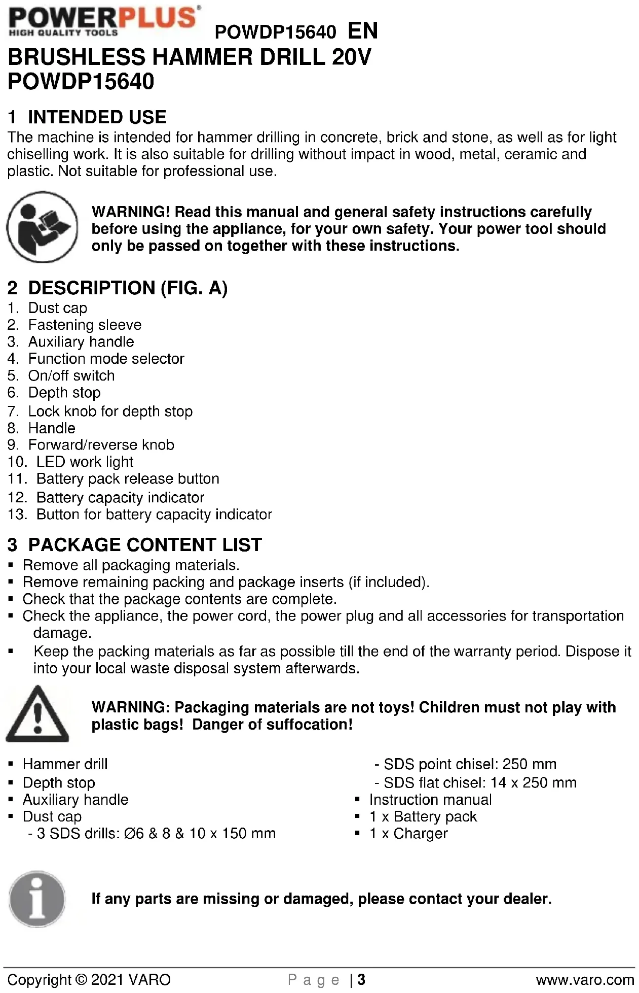 Download the instructions for your Drill in PDF format for free! Find your manual POWDP15640 - PowerPlus and take your electronic device back in hand. On this page are published all the documents necessary for the use of your device. POWDP15640 by PowerPlus.