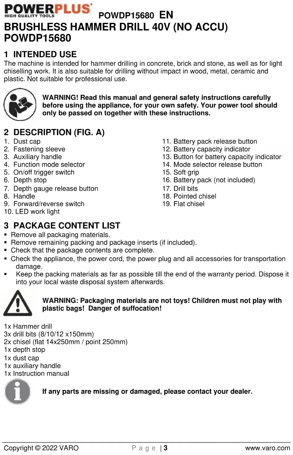 Download the instructions for your Drill in PDF format for free! Find your manual POWDP15680 - PowerPlus and take your electronic device back in hand. On this page are published all the documents necessary for the use of your device. POWDP15680 by PowerPlus.