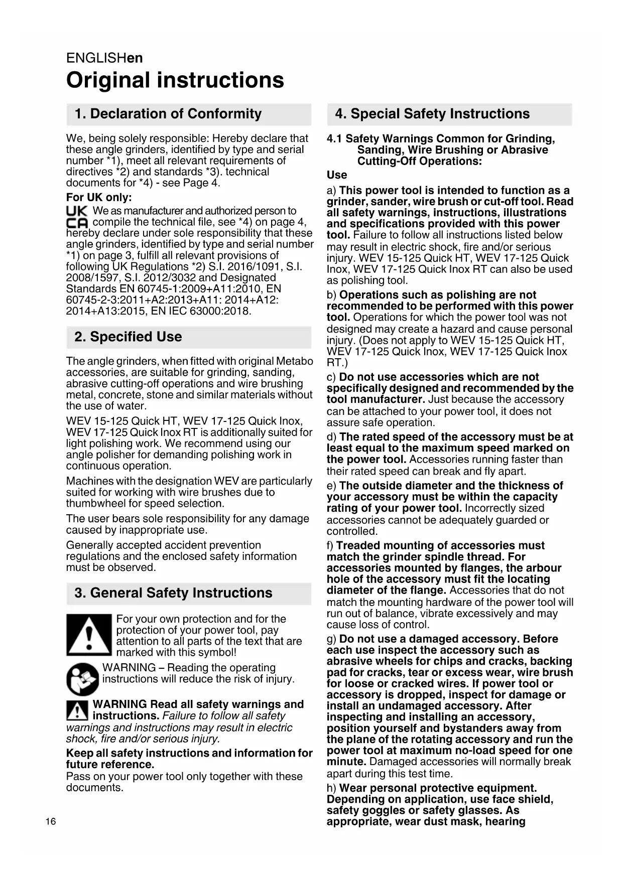 Original instructions We, being solely responsible: Hereby declare that these angle grinders, identified by type and serial number *1), meet all relevant requirements of directives *2) and standards *3). technical documents for *4) - see Page 4. For UK only: We as manufacturer and authorized person to compile the technical file, see *4) on page 4, hereby declare under sole responsibility that these angle grinders, identified by type and serial number *1) on page 3, fulfill all relevant provisions of following UK Regulations *2) S.I. 2016/1091, S.I. 2008/1597, S.I. 2012/3032 and Designated Standards EN 60745-1:2009+A11:2010, EN 60745-2-3:2011+A2:2013+A11: 2014+A12: 2014+A13:2015, EN IEC 63000:2018. The angle grinders, when fitted with original Metabo accessories, are suitable for grinding, sanding, abrasive cutting-off operations and wire brushing metal, concrete, stone and similar materials without the use of water. WEV 15-125 Quick HT, WEV 17-125 Quick Inox, WEV 17-125 Quick Inox RT is additionally suited for light polishing work. We recommend using our angle polisher for demanding polishing work in continuous operation. Machines with the designation WEV are particularly suited for working with wire brushes due to thumbwheel for speed selection. The user bears sole responsibility for any damage caused by inappropriate use. Generally accepted accident prevention regulations and the enclosed safety information must be observed. For your own protection and for the protection of your power tool, pay attention to all parts of the text that are marked with this symbol! WARNING – Reading the operating instructions will reduce the risk of injury. WARNING Read all safety warnings and instructions. Failure to follow all safety warnings and instructions may result in electric shock, fire and/or serious injury. Keep all safety instructions and information for future reference. Pass on your power tool only together with these documents.