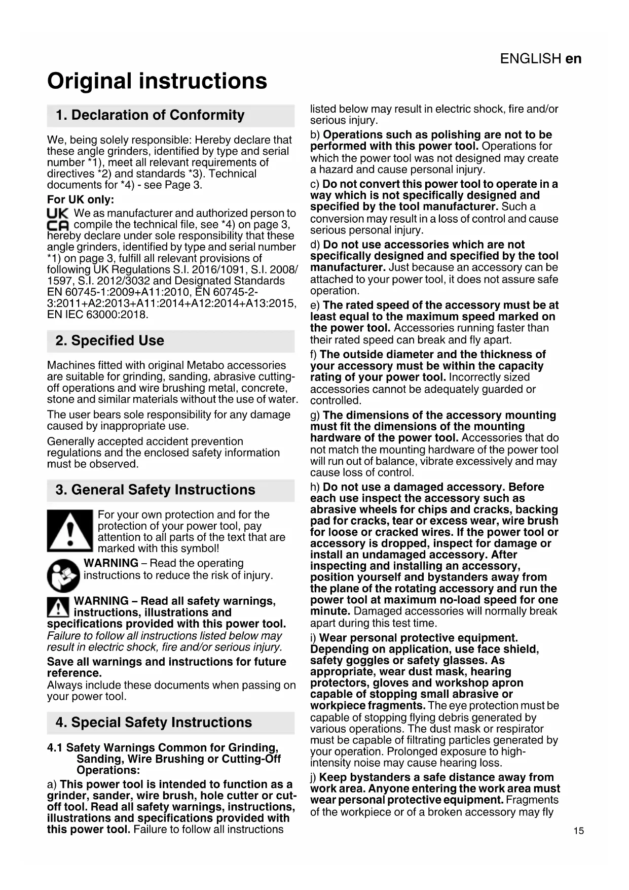 UK We as manufacturer and authorized person to compile the technical file, see *4) on page 3, hereby declare under sole responsibility that these angle grinders, identified by type and serial number *1) on page 3, fulfill all relevant provisions of following UK Regulations S.I. 2016/1091, S.I. 2008/ 1597,S.I.2012/3032 and Designated Standards EN 60745-1:2009+A11:2010,EN 60745-2- 3:2011+A2:2013+A11:2014+A12:2014+A13:2015, EN IEC 63000:2018.