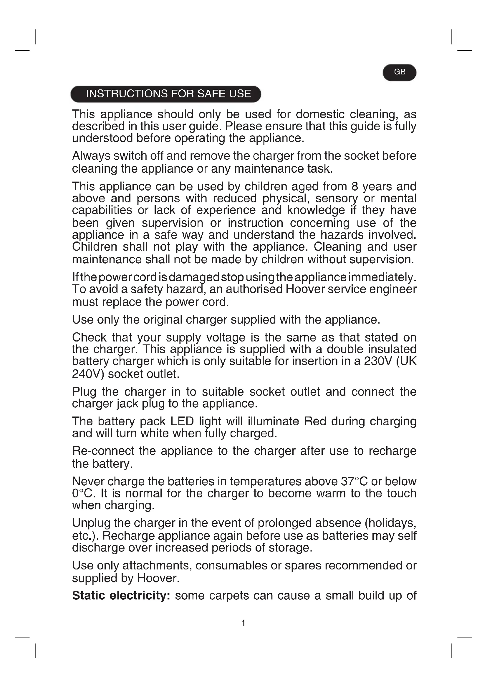 This appliance should only be used for domestic cleaning, as described in this user guide. Please ensure that this guide is fully understood before operating the appliance. Always switch off and remove the charger from the socket before cleaning the appliance or any maintenance task. This appliance can be used by children aged from 8 years and above and persons with reduced physical, sensory or mental capabilities or lack of experience and knowledge if they have been given supervision or instruction concerning use of the appliance in a safe way and understand the hazards involved. Children shall not play with the appliance. Cleaning and user maintenance shall not be made by children without supervision. If the power cord is damaged stop using the appliance immediately. To avoid a safety hazard, an authorised Hoover service engineer must replace the power cord. Use only the original charger supplied with the appliance. Check that your supply voltage is the same as that stated on the charger. This appliance is supplied with a double insulated battery charger which is only suitable for insertion in a 230V (UK 240V) socket outlet. Plug the charger in to suitable socket outlet and connect the charger jack plug to the appliance. The battery pack LED light will illuminate Red during charging and will turn white when fully charged. Re-connect the appliance to the charger after use to recharge the battery. Never charge the batteries in temperatures above 37°C or below 0°C. It is normal for the charger to become warm to the touch when charging. Unplug the charger in the event of prolonged absence (holidays, etc.). Recharge appliance again before use as batteries may self discharge over increased periods of storage. Use only attachments, consumables or spares recommended or supplied by Hoover. Static electricity: some carpets can cause a small build up of GB2 static electricity. Any static discharge is not hazardous to health. Keep hands, feet, loose clothing and hair away from rotating brushes. Do not unplug the charger by pulling on the power cord. Do not use your appliance out of doors or on any wet surface or for wet pick up. Do not pick up hard or sharp objects, matches, hot ashes, cigarette ends or other similar items. Do not spray with or pick up flammable liquids, cleaning fluids, aerosols or their vapours. Do not run over the power cord when using your appliance or remove the plug by pulling on the power cord. Do not continue to use your appliance or charger if it appears faulty. Do not use the appliance to clean animals or people. Do not replace the batteries with non-rechargeable batteries. Hoover service: To ensure the continued safe and efficient operation of this appliance we recommend that any servicing or repairs are only carried out by an authorised Hoover service engineer. End of product Life disposal If the appliance is to be disposed of the batteries must first be removed. The appliance must be disconnected from the supply mains when removing the battery. Dispose of the batteries safely. Run the appliance until it stops because the batteries are fully discharged. Used batteries should be taken to a recycling station and not disposed of with household waste. To remove the batteries, please contact the Hoover Customer Centre or proceed according to the following instructions. IMPORTANT: Always fully discharge the batteries before removal. Run the cleaner until the batteries are completely empty. Remove the charger jack plug from the appliance. Press the battery pack release buttons and slide to remove. Note: Should you experience any difficulty in dismantling the unit or for more detailed information on treatment, recovery and recycling of this appliance, please contact your local city office or your household waste disposal service. GBPRODUCT COMPONENTS