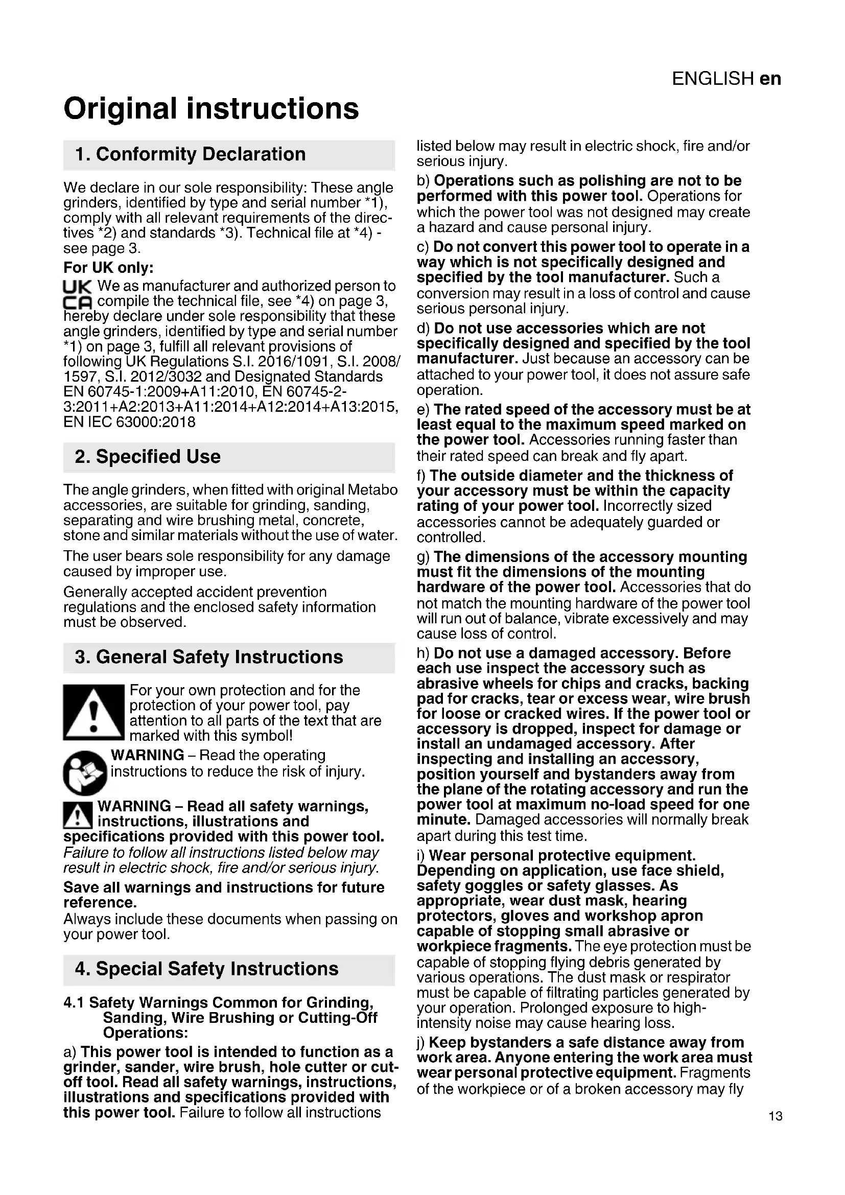 Original instructions We declare in our sole responsibility: These angle grinders, identified by type and serial number *1), comply with all relevant requirements of the direc- tives *2) and standards *3). Technical file at *4) - see page 3. For UK only: We as manufacturer and authorized person to compile the technical file, see *4) on page 3, hereby declare under sole responsibility that these angle grinders, identified by type and serial number *1) on page 3, fulfill all relevant provisions of following UK Regulations S.I. 2016/1091, S.I. 2008/ 1597, S.I. 2012/3032 and Designated Standards EN 60745-1:2009+A11:2010, EN 60745-2- 3:2011+A2:2013+A11:2014+A12:2014+A13:2015, EN IEC 63000:2018 The angle grinders, when fitted with original Metabo accessories, are suitable for grinding, sanding, separating and wire brushing metal, concrete, stone and similar materials without the use of water. The user bears sole responsibility for any damage caused by improper use. Generally accepted accident prevention regulations and the enclosed safety information must be observed. For your own protection and for the protection of your power tool, pay attention to all parts of the text that are marked with this symbol! WARNING – Read the operating instructions to reduce the risk of injury. WARNING – Read all safety warnings, instructions, illustrations and specifications provided with this power tool. Failure to follow all instructions listed below may result in electric shock, fire and/or serious injury. Save all warnings and instructions for future reference. Always include these documents when passing on your power tool.