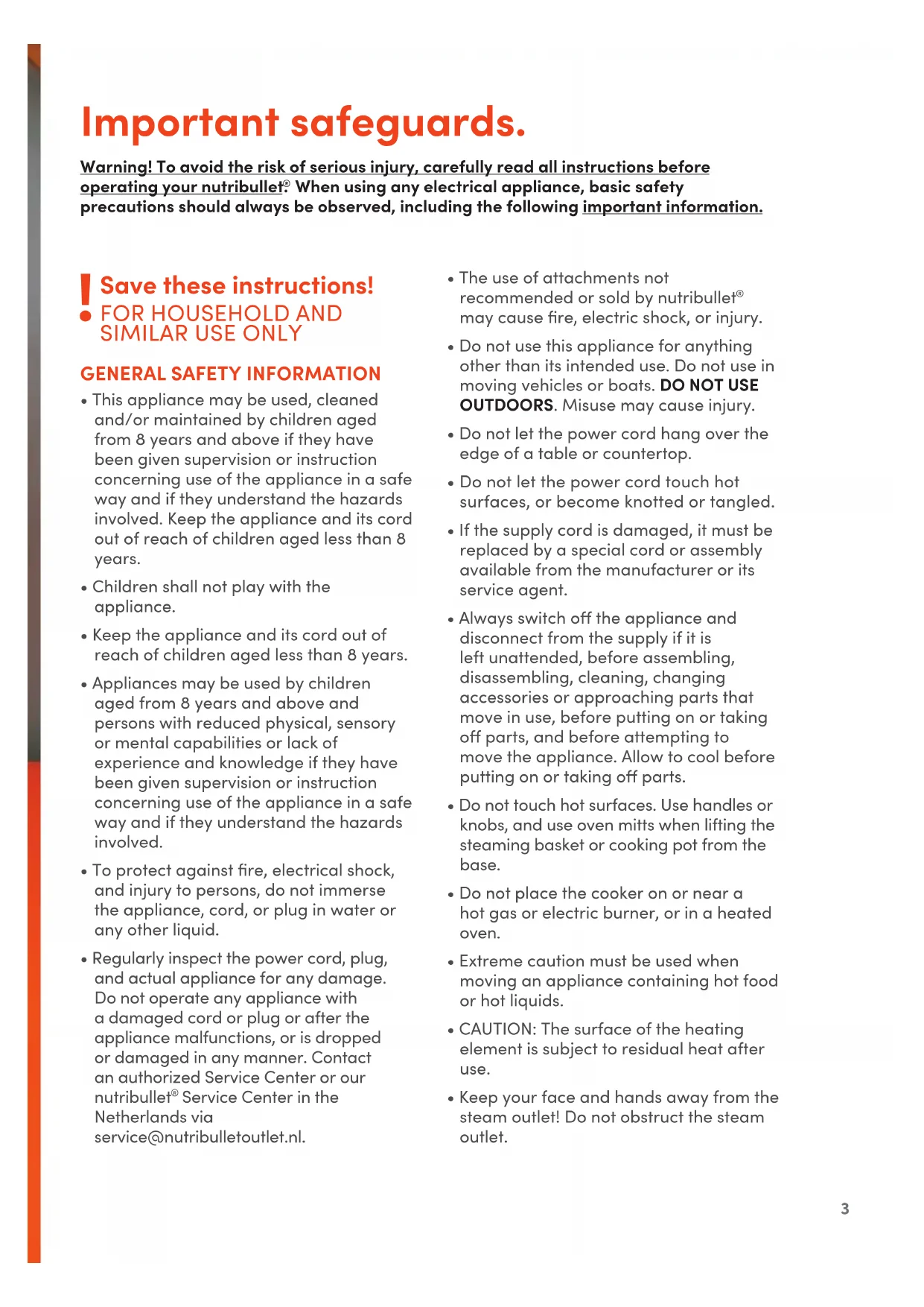 GENERAL SAFETY INFORMATION• This appliance may be used, cleaned and/or maintained by children aged from 8 years and above if they have been given supervision or instruction concerning use of the appliance in a safe way and if they understand the hazards involved. Keep the appliance and its cord out of reach of children aged less than 8 years. • Children shall not play with the appliance.• Keep the appliance and its cord out of reach of children aged less than 8 years.• Appliances may be used by children aged from 8 years and above and persons with reduced physical, sensory or mental capabilities or lack of experience and knowledge if they have been given supervision or instruction concerning use of the appliance in a safe way and if they understand the hazards involved.• To protect against fire, electrical shock, and injury to persons, do not immerse the appliance, cord, or plug in water or any other liquid.• Regularly inspect the power cord, plug, and actual appliance for any damage. Do not operate any appliance with a damaged cord or plug or after the appliance malfunctions, or is dropped or damaged in any manner. Contact an authorized Service Center or our nutribullet Service Center in the Netherlands via service@nutribulletoutlet.nl. • The use of attachments not recommended or sold by nutribullet