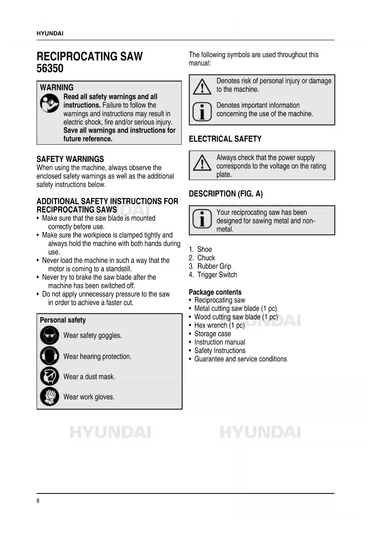 - Do not apply unnecessary pressure to the saw in order to achieve a faster cut. Personal safety Wear safety goggles. Wear hearing protection. Wear a dust mask. Wear work gloves. The following symbols are used throughout this manual: Denotes risk of personal injury or damage to the machine. Denotes important information concerning the use of the machine. ELECTRICAL SAFETY Always check that the power supply corresponds to the voltage on the rating plate. DESCRIPTION (FIG. A) Your reciprocating saw has been designed for sawing metal and non- metal.