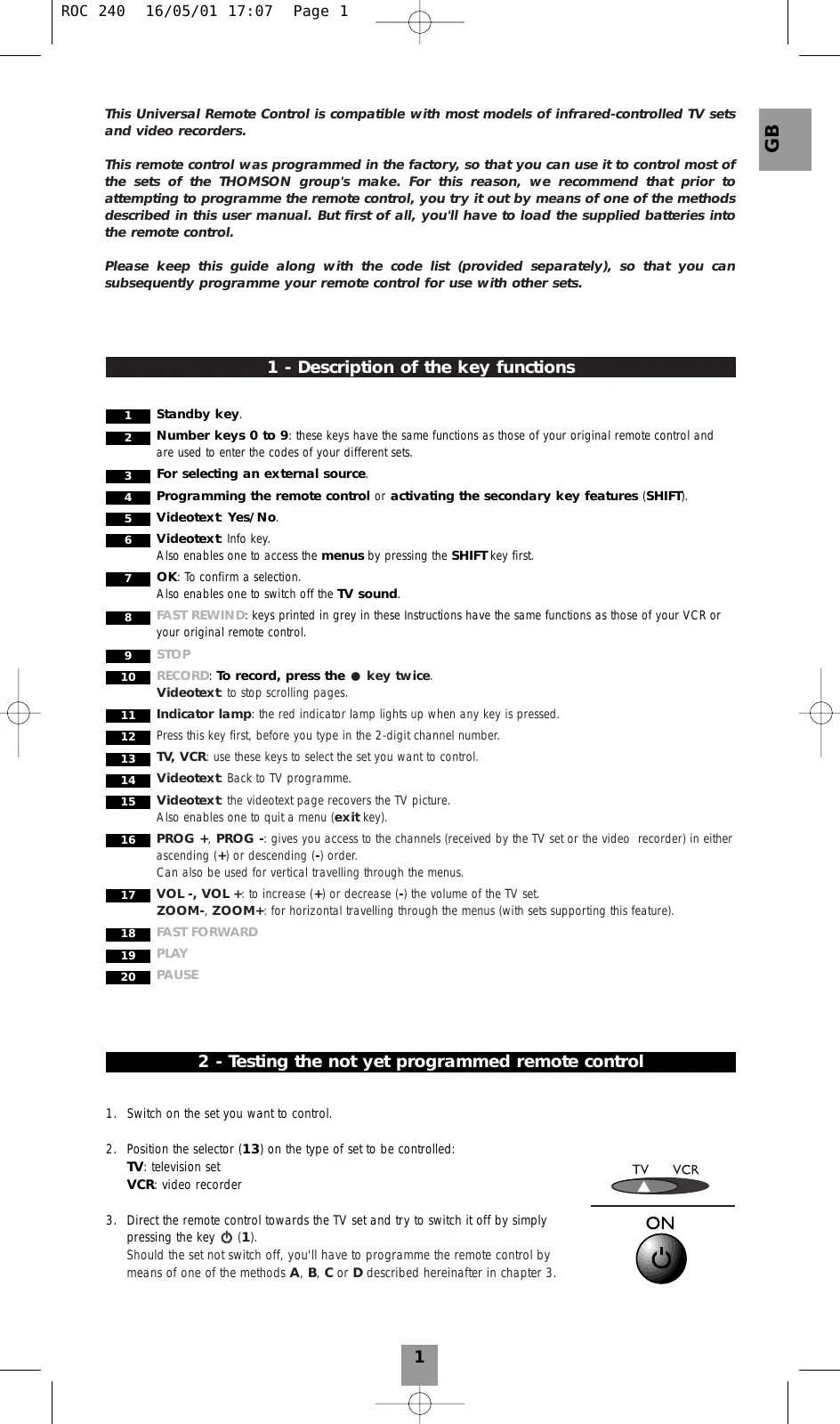 (TV set or video recorder). Refer to the list provided with these instructions, page I of the subcodes. 1. Switch on the set you want to control. 2. Position the selector (13) on the type of set to be controlled: TV: television set, VCR: video recorder 3. Hold down the key SHIFT (4) until the red indicator lamp (11) remains lit (the indicator lamp remains on for a couple of seconds, so that you have time enough to proceed with steps 4 to 6. The indicator lamp flashes to signal that this time is almost up, and then goes off). 4. While the indicator is lit, type in the subcode (example: 1 for THOMSON).