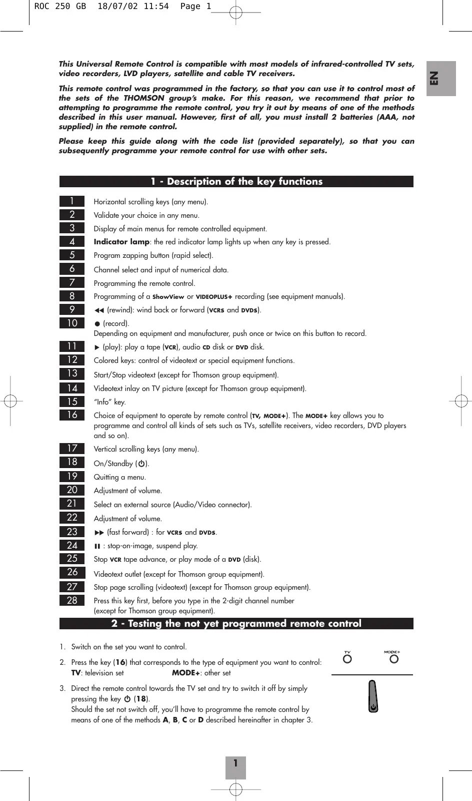 ENGLISH - Do not mix different types of batteries or new and old batteries. Do not use rechargeable batteries. In order to avoid any risk of explosion, observe polarities indicated inside the battery compartment. Replace only with the type of batteries specified above. Do not throw them into fire, do not recharge them. If you are not using the remote control for a long period of time, remove the batteries. Please respect the environment and prevailing regulations. Before you dispose of batteries or accumulators, ask your dealer whether they are subject to special recycling and if they will accept them for disposal. This Universal Remote Control is compatible with most models of infrared-controlled TV sets, video recorders, LVD players, satellite and cable TV receivers. This remote control was programmed in the factory, so that you can use it to control most of the sets of the THOMSON group’s make. For this reason, we recommend that prior to attempting to programme the remote control, you try it out by means of one of the methods described in this user manual. However, first of all, you must install 2 batteries (AAA, not supplied) in the remote control. Please keep this guide along with the code list (provided separately), so that you can subsequently programme your remote control for use with other sets.