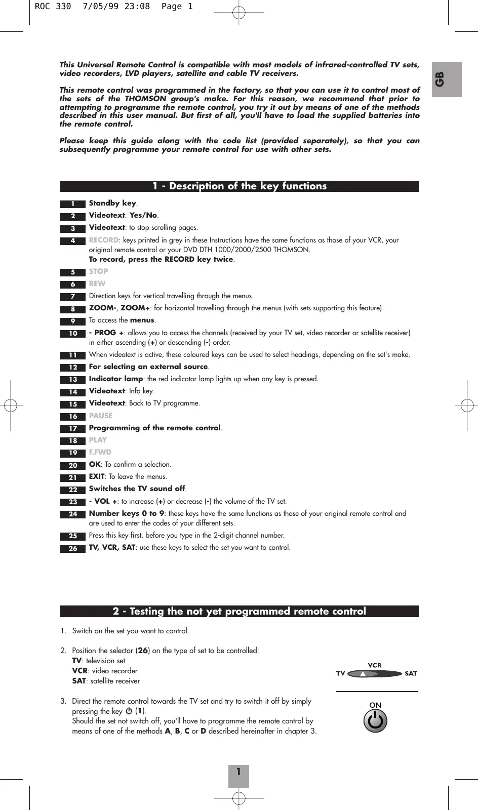 Download the instructions for your Remote control in PDF format for free! Find your manual ROC 330 - THOMSON and take your electronic device back in hand. On this page are published all the documents necessary for the use of your device. ROC 330 by THOMSON.