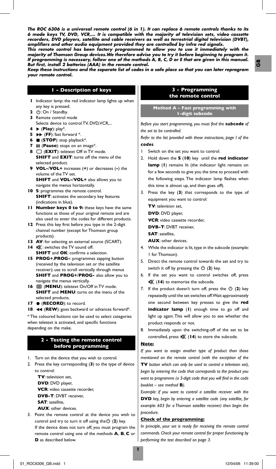 The ROC 6306 is a universal remote control (6 in 1). It can replace 6 remote controls thanks to its 6 mode keys TV, DVD, VCR,... It is compatible with the majority of television sets, video cassette recorders, DVD players, satellite and cable receivers as well as terrestrial digital television (DVBT), amplifiers and other audio equipment provided they are controlled by infra red signals. This remote control has been factory programmed to allow you to use it immediately with the majority of Thomson Group devices.We therefore advise you to try it before beginning to program it. If programming is necessary, follow one of the methods A, B, C, D or E that are given in this manual. But first, install 2 batteries (AAA) in the remote control. Keep these instructions and the separate list of codes in a safe place so that you can later reprogram your remote control.