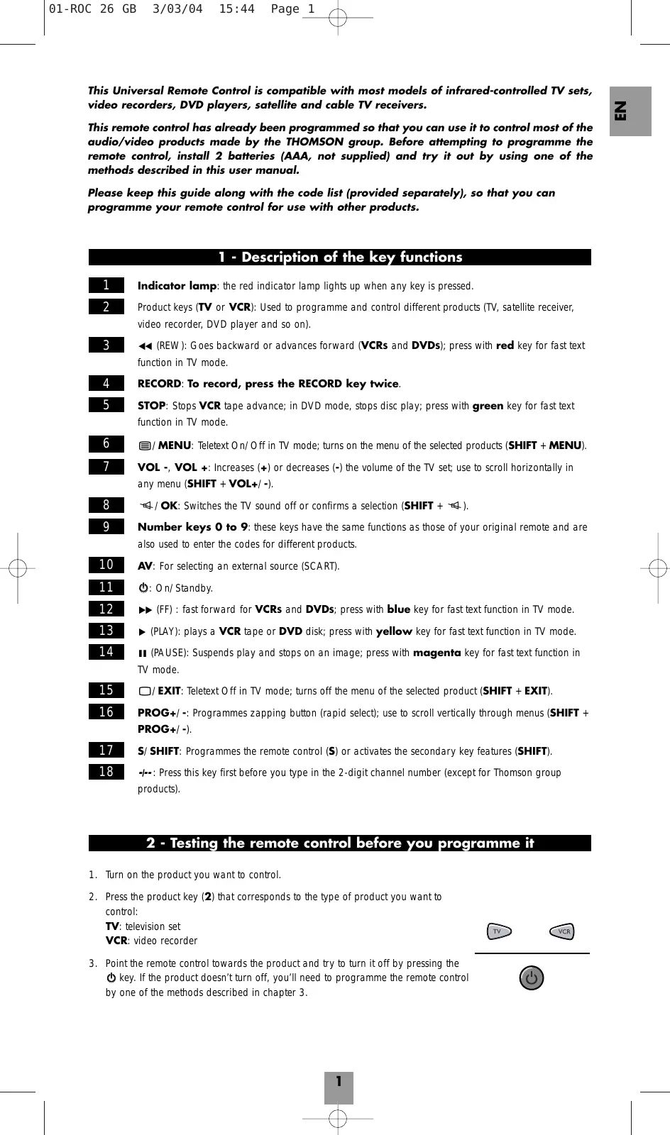 This Universal Remote Control is compatible with most models of infrared-controlled TV sets, video recorders, DVD players, satellite and cable TV receivers. This remote control has already been programmed so that you can use it to control most of the audio/video products made by the THOMSON group. Before attempting to programme the remote control, install 2 batteries (AAA, not supplied) and try it out by using one of the methods described in this user manual. Please keep this guide along with the code list (provided separately), so that you can programme your remote control for use with other products.
