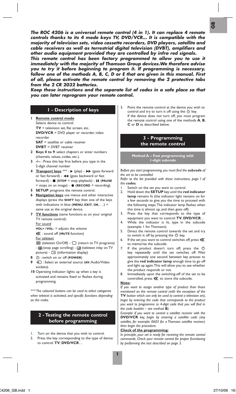 GB The ROC 4206 is a universal remote control (4 in 1). It can replace 4 remote controls thanks to its 4 mode keys TV, DVD/VCR... It is compatible with the majority of television sets, video cassette recorders, DVD players, satellite and cable receivers as well as terrestrial digital television (DVBT), amplifiers and other audio equipment provided they are controlled by infra red signals. This remote control has been factory programmed to allow you to use it immediately with the majority of Thomson Group devices.We therefore advise you to try it before beginning to program it. If programming is necessary, follow one of the methods A, B, C, D or E that are given in this manual. First of all, please activate the remote control by removing the 2 protective tabs from the 2 CR 2032 batteries. Keep these instructions and the separate list of codes in a safe place so that you can later reprogram your remote control. 3.