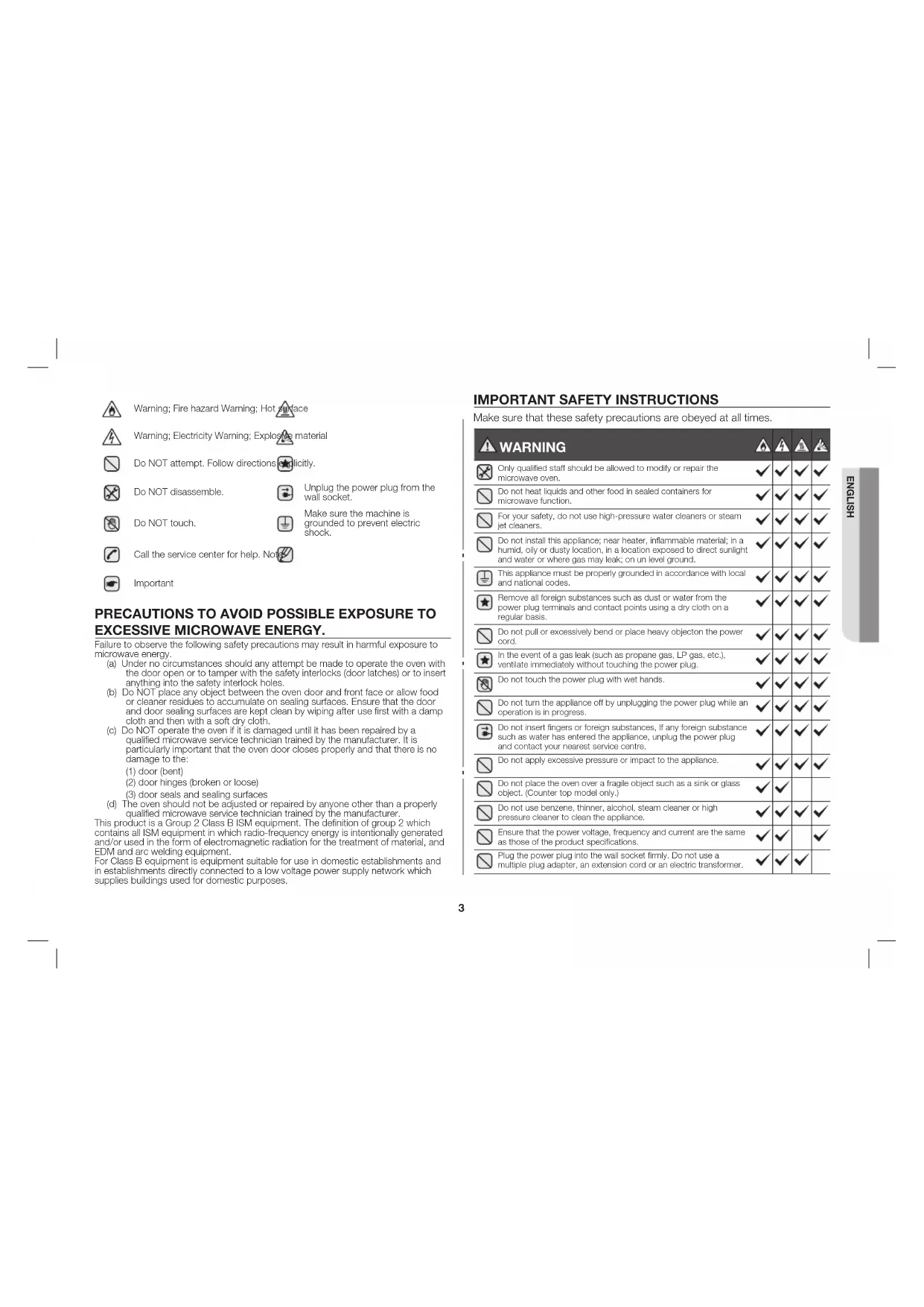 EXCESSIVE MICROWAVE ENERGY. Failure to observe the following safety precautions may result in harmful exposure to microwave energy. (a) Under no circumstances should any attempt be made to operate the oven with the door open or to tamper with the safety interlocks (door latches) or to insert anything into the safety interlock holes. (b) Do NOT place any object between the oven door and front face or allow food or cleaner residues to accumulate on sealing surfaces. Ensure that the door and door sealing surfaces are kept clean by wiping after use first with a damp cloth and then with a soft dry cloth. (c) Do NOT operate the oven if it is damaged until it has been repaired by a qualified microwave service technician trained by the manufacturer. It is particularly important that the oven door closes properly and that there is no damage to the: (1) door (bent) (2) door hinges (broken or loose) (3) door seals and sealing surfaces (d) The oven should not be adjusted or repaired by anyone other than a properly qualified microwave service technician trained by the manufacturer. This product is a Group 2 Class B ISM equipment. The definition of group 2 which contains all ISM equipment in which radio-frequency energy is intentionally generated and/or used in the form of electromagnetic radiation for the treatment of material, and EDM and arc welding equipment. For Class B equipment is equipment suitable for use in domestic establishments and in establishments directly connected to a low voltage power supply network which supplies buildings used for domestic purposes.