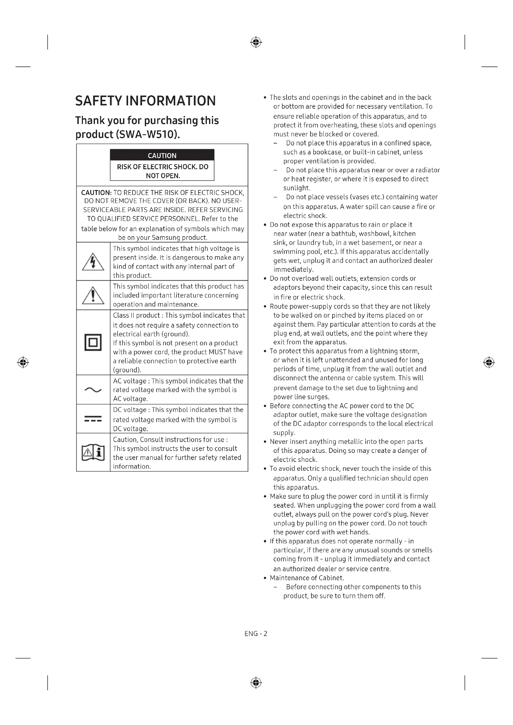 TO QUALIFIED SERVICE PERSONNEL. Refer to the table below for an explanation of symbols which may be on your Samsung product. This symbol indicates that high voltage is present inside. It is dangerous to make any kind of contact with any internal part of this product. This symbol indicates that this product has included important literature concerning operation and maintenance. Class II product : This symbol indicates that it does not require a safety connection to electrical earth (ground). If this symbol is not present on a product with a power cord, the product MUST have a reliable connection to protective earth (ground). AC voltage : This symbol indicates that the rated voltage marked with the symbol is AC voltage. DC voltage : This symbol indicates that the rated voltage marked with the symbol is DC voltage. Caution, Consult instructions for use : This symbol instructs the user to consult the user manual for further safety related information.