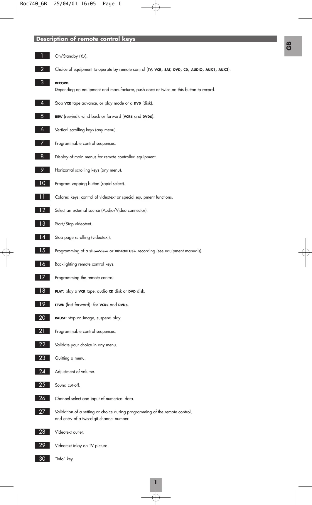 Note: if the original item’s remote control does not have a key with a function similar to the scrolling, you can make code search by using the PLAY key for a VCR or the ON key (1). PROG key for ‘zapping’ or rapid channel Code search will start with the last-stored code for the mode currently selected, for example if that mode has 100 codes and the stored code is 050 code search will start at 051 and range to 100, then restart from 000 through 050. This will ease your code selection task where several codes apply to your equipment item, by skipping any codes already tested. After code search and when you manually select the code you must be sure you selected the right code, that one or ones giving control of all equipment item functions. Where you find that certain functions are still not able to be remote controlled because no code allows you to reproduce all capacities of the item’s original remote control, your ROC 740 can load the missing functions through its learning mode. Programming control for a COMBO (combined TV/VCR) Programming the remote control for a COMBO breaks down to programming it once as a TV, and a second time as a VCR, these being the two main functions of a COMBO. Before starting to program, find the right codes for the TV and the VCR functions of your COMBO, then follow the procedure in “Storage of listed codes in memory” in the previous paragraph.